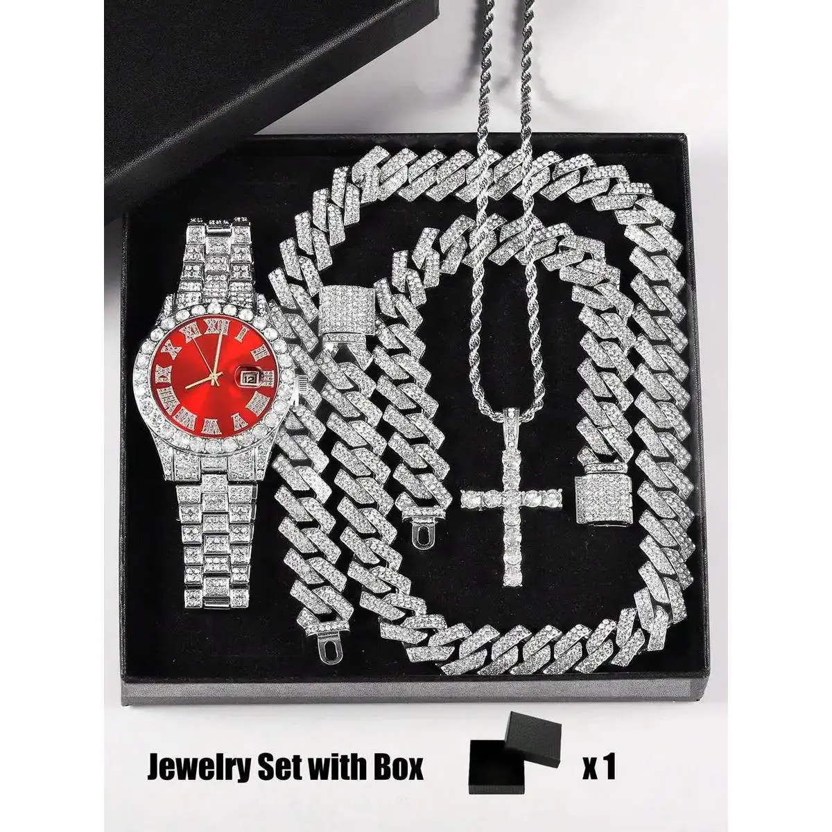 Luxury Punk Watch Set with Necklace Bracelet Cross Pendant, Analog Quartz Movement, Adjustable Strap, Unisex Gift Box for All Seasons, Fashionable Jewelry Set