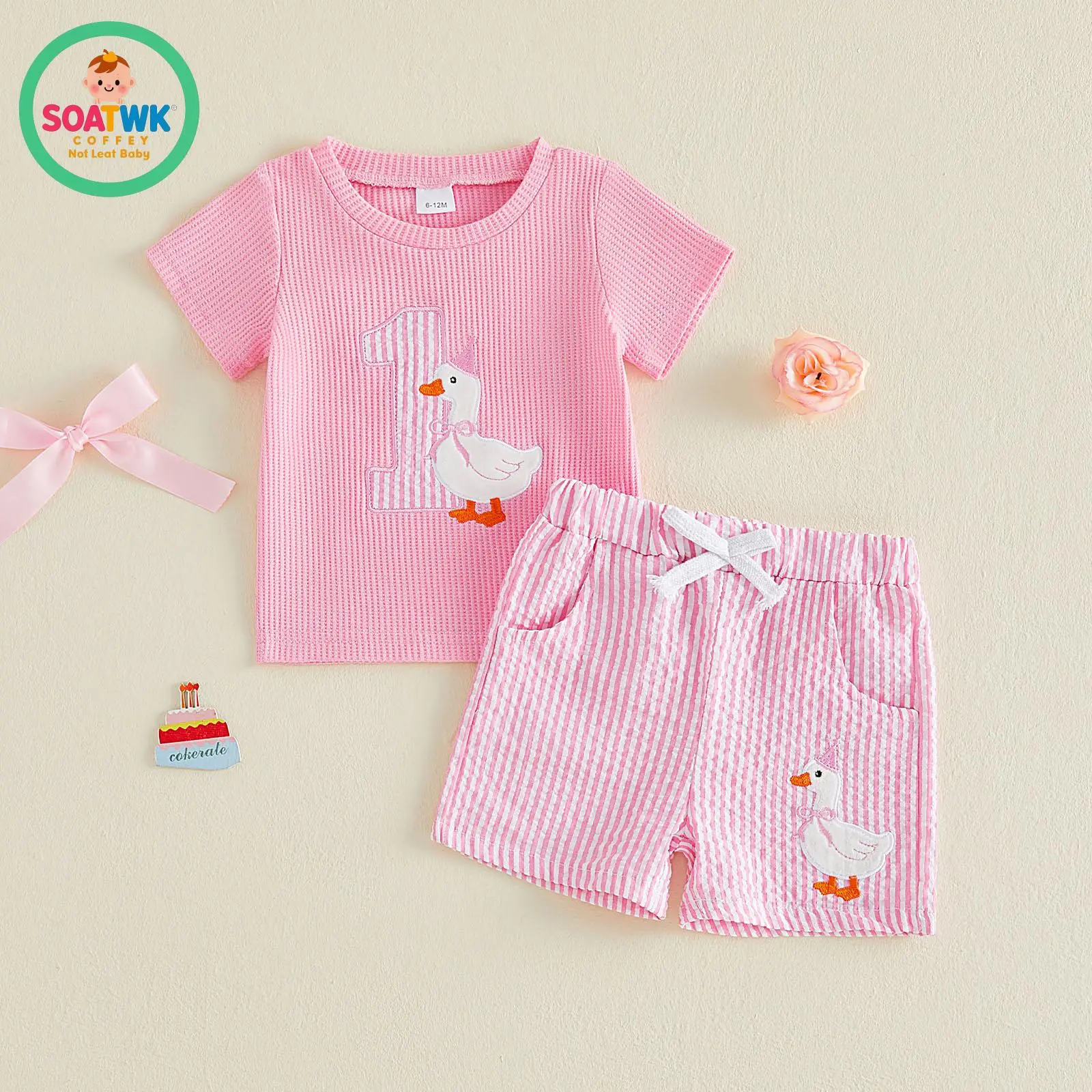 Baby Girls Birthday Outfit, Short Sleeve Embroidery Duck T-shirt with Striped Shorts Summer 2-piece Outfit