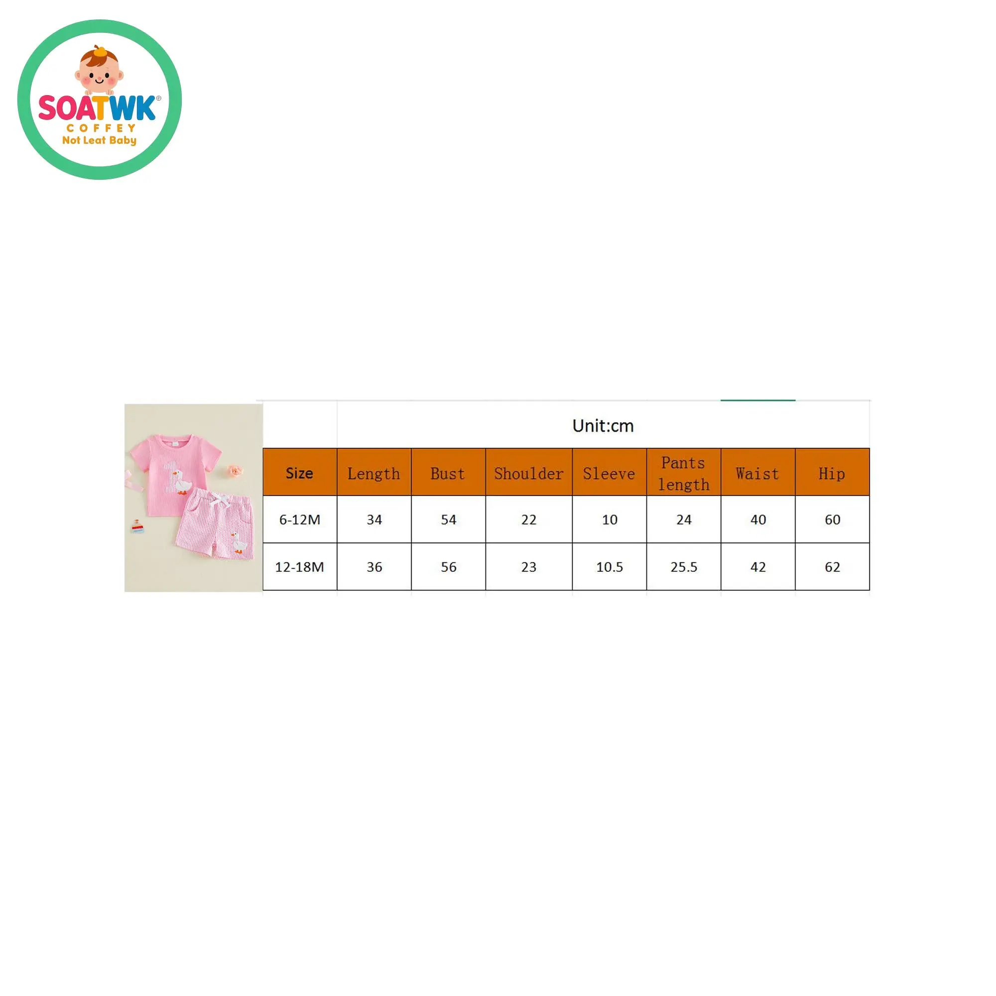 6-12M Length: 34 Bust: 54 Shoulder: 22 Sleeve: 10 Pants length: 24 Waist: 40 Hip: 60 Advised Age: 6-12 Months
