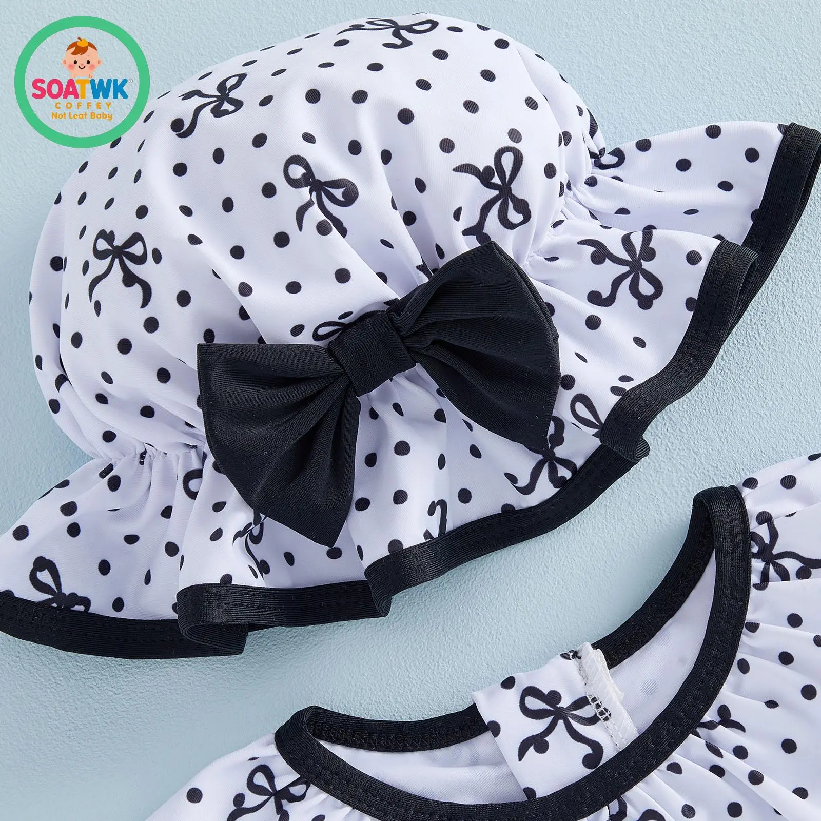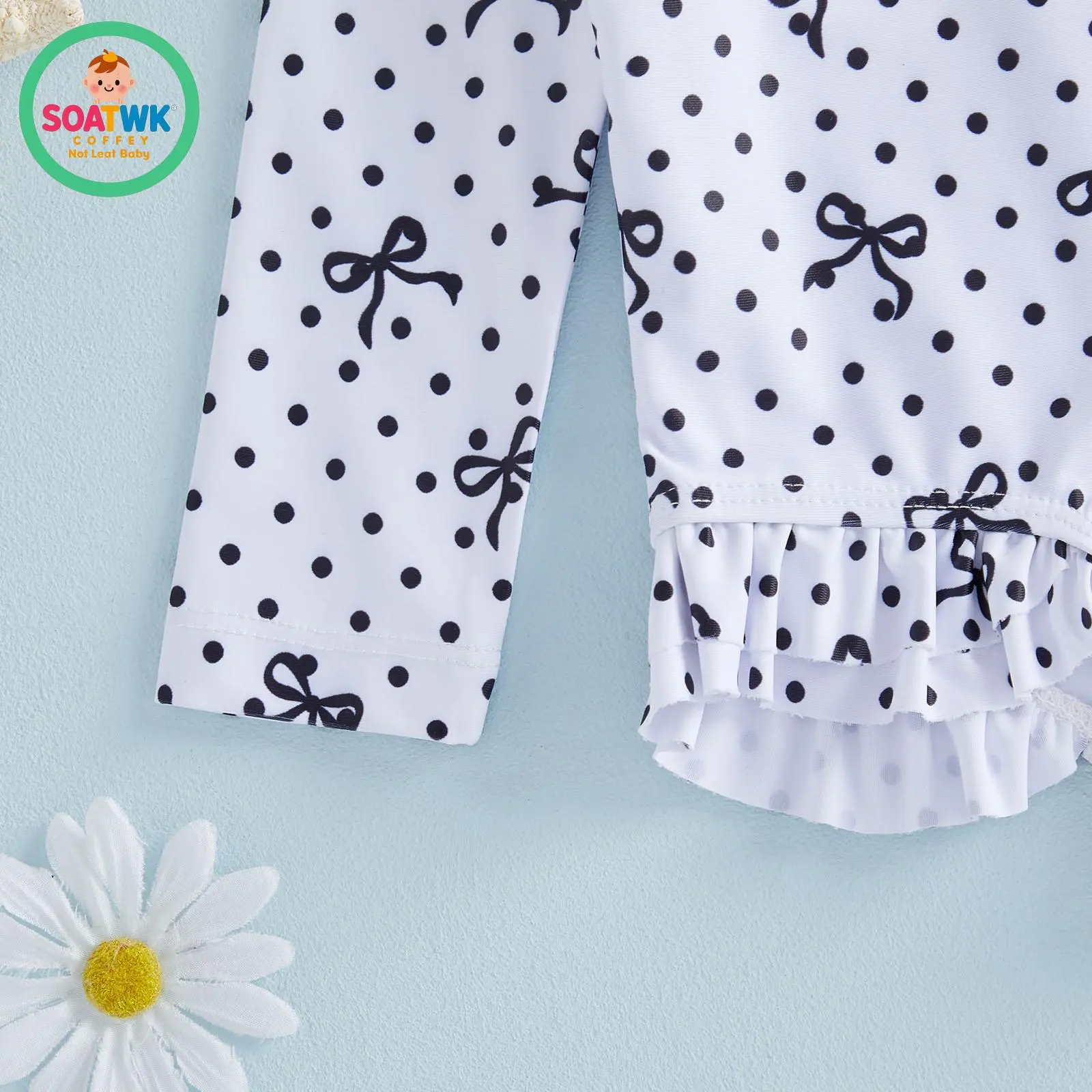 Toddler Girls Swimsuit, Bow Dots Print Long Sleeve Bikini with Hat Swimwear for Summer Bathing