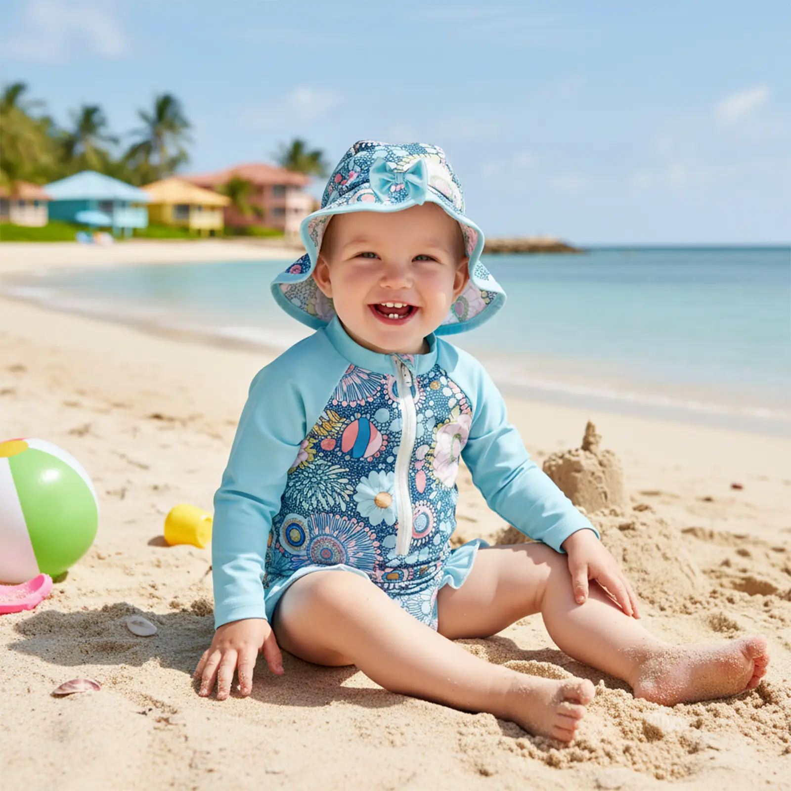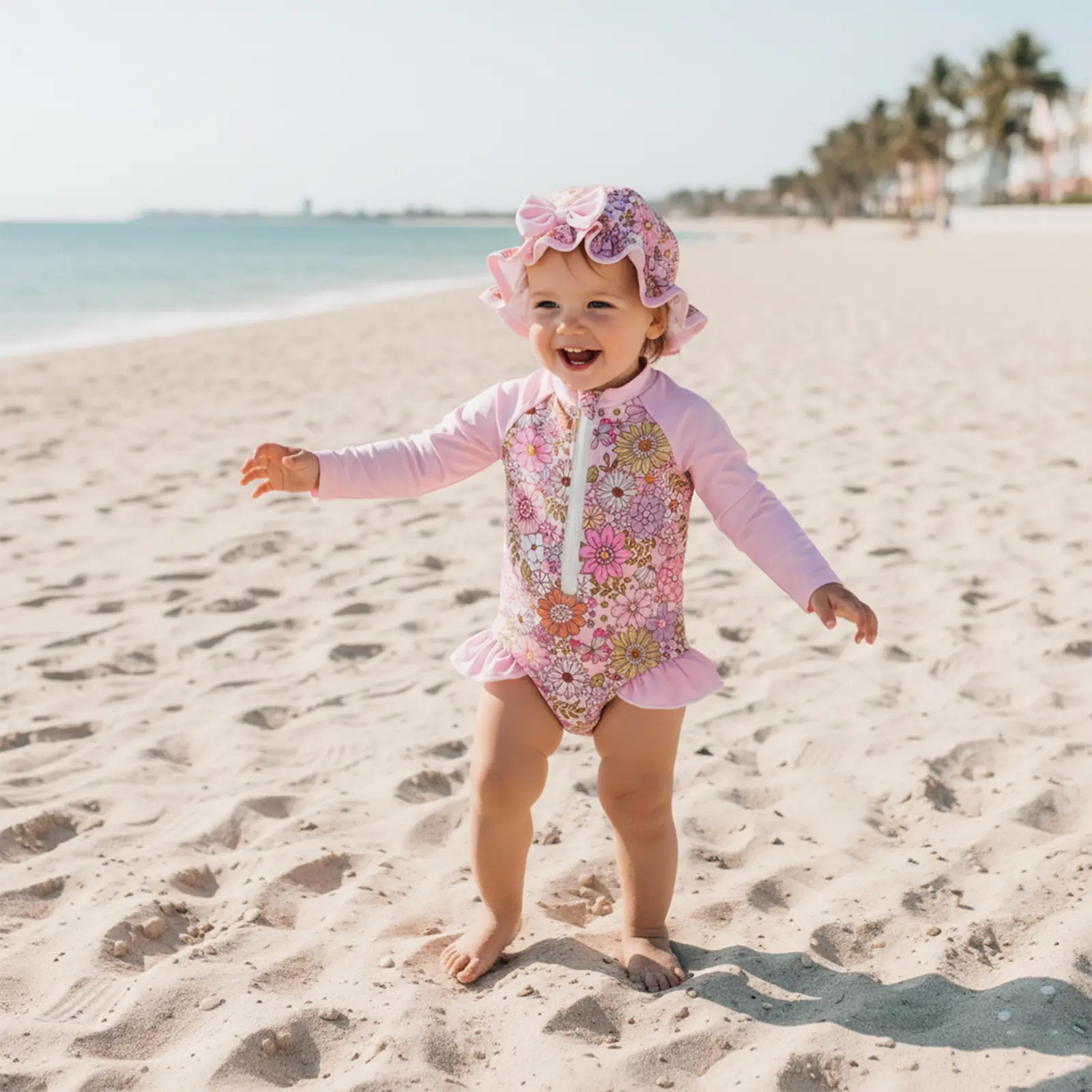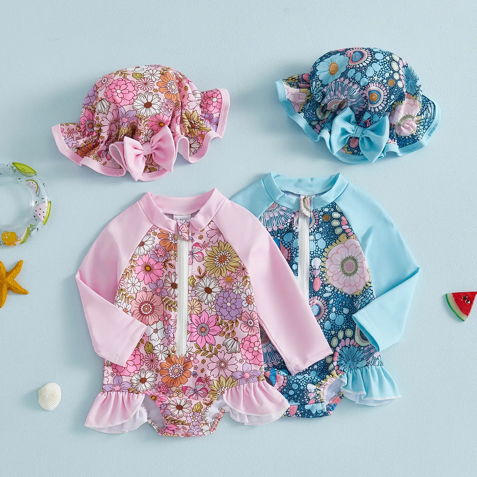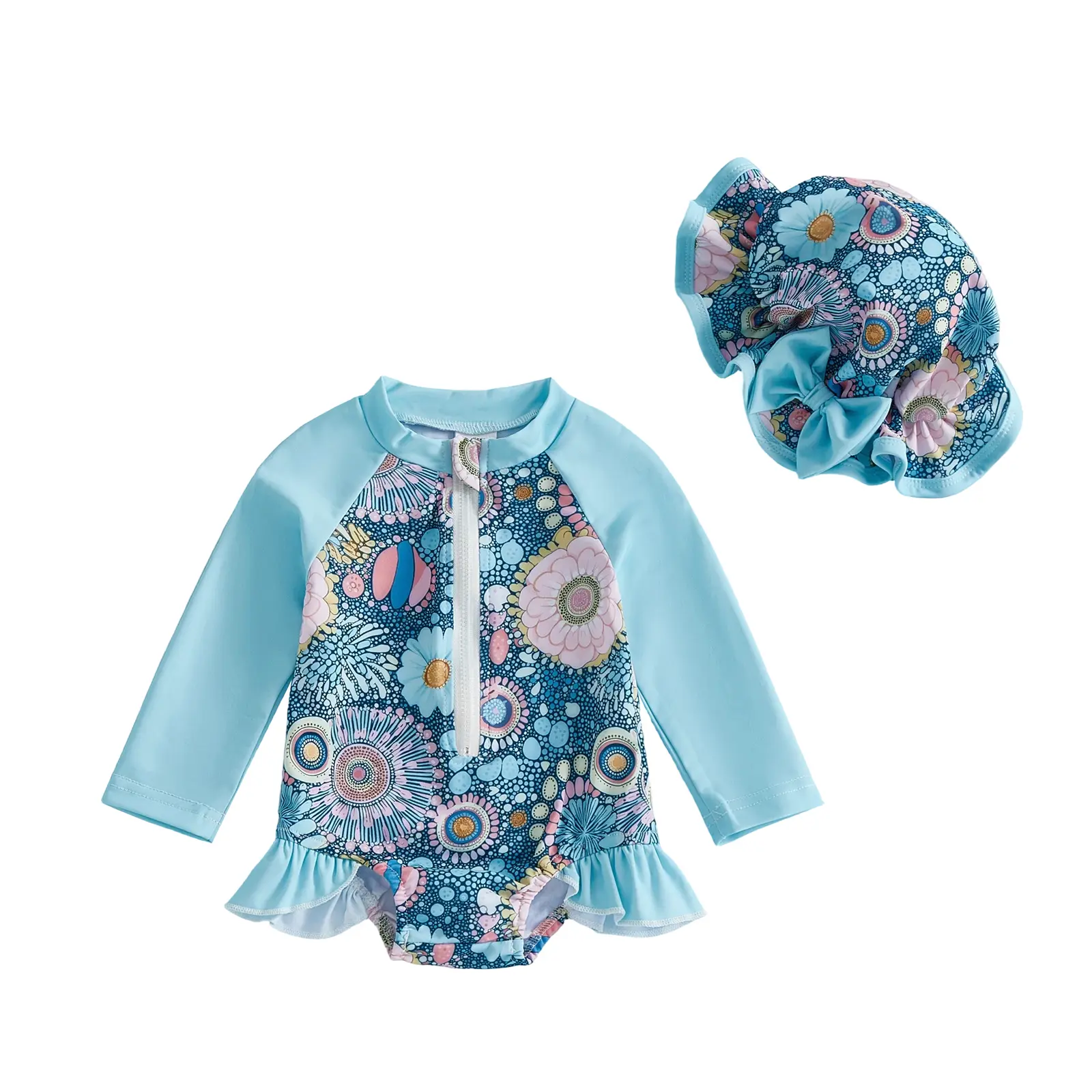 Baby Girl Swimsuit Set Floral Rash Guard Long Sleeve Zip-up Bathing Suit with Cap 2 Piece Set