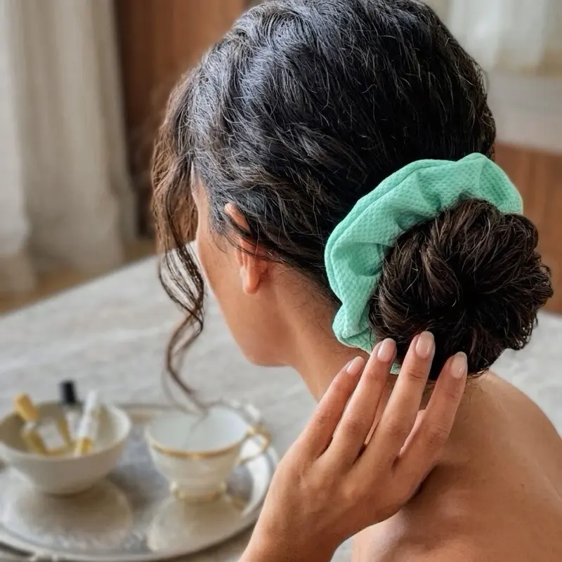 Made from soft, breathable waffle‑textured fabric, this mint scrunchie adds comfort, volume, and a casual‑chic charm to any hairstyle. Its rounded, full shape creates a polished finish, while the mint tone brings a modern and refreshing pop of color.