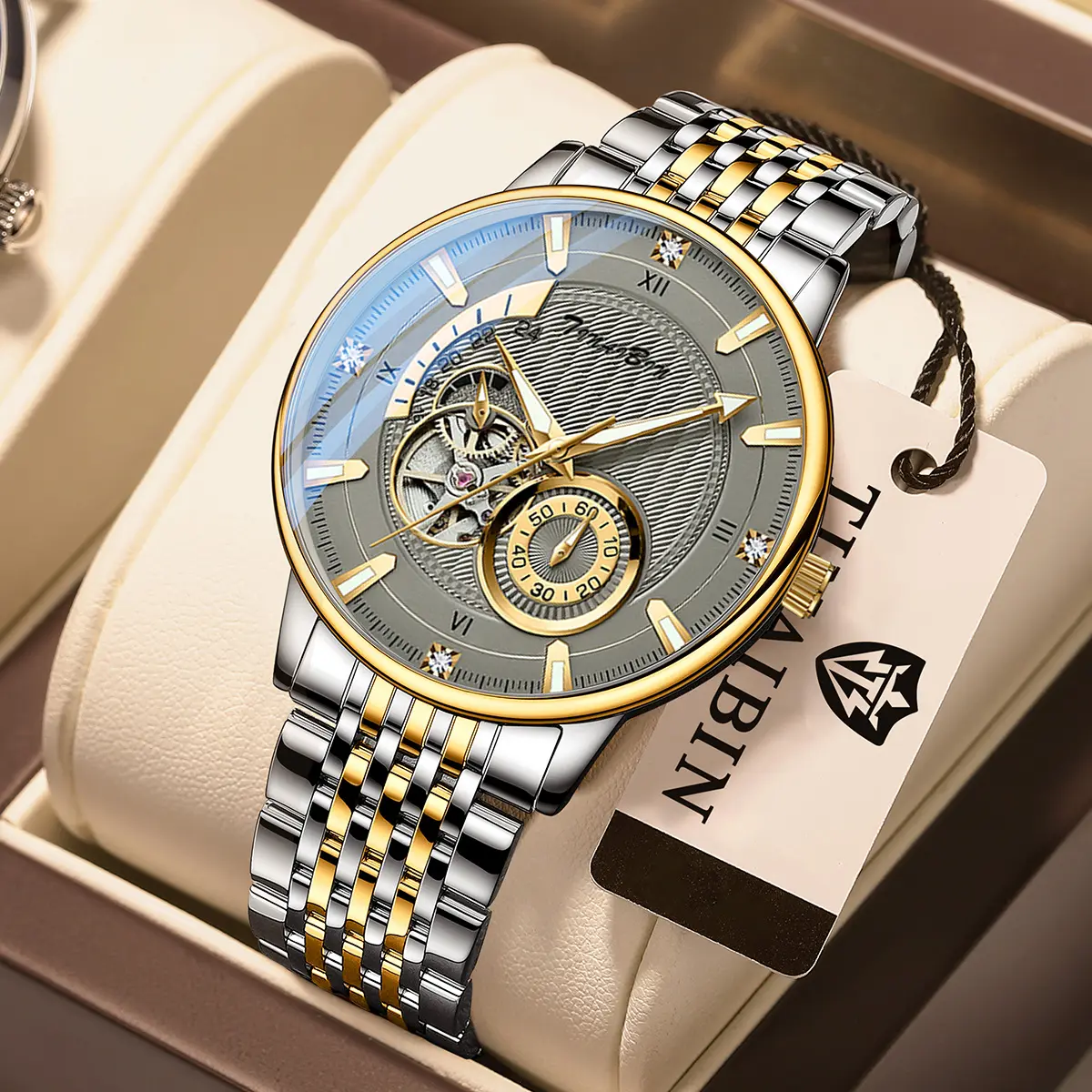 TINAIBIN Men's Diamond Business Formal Pointer Automatic Mechanical Watch Stainless Steel Waterproof Luminous Two-color Luxury Casual Watch