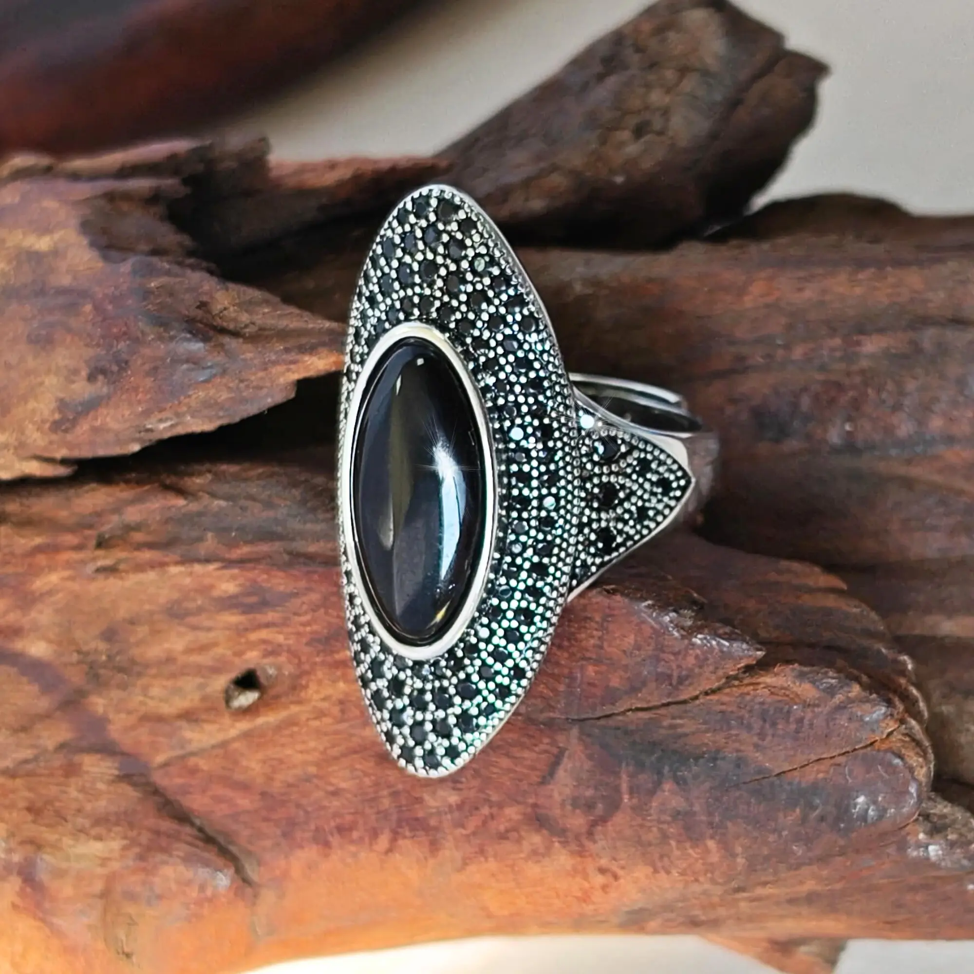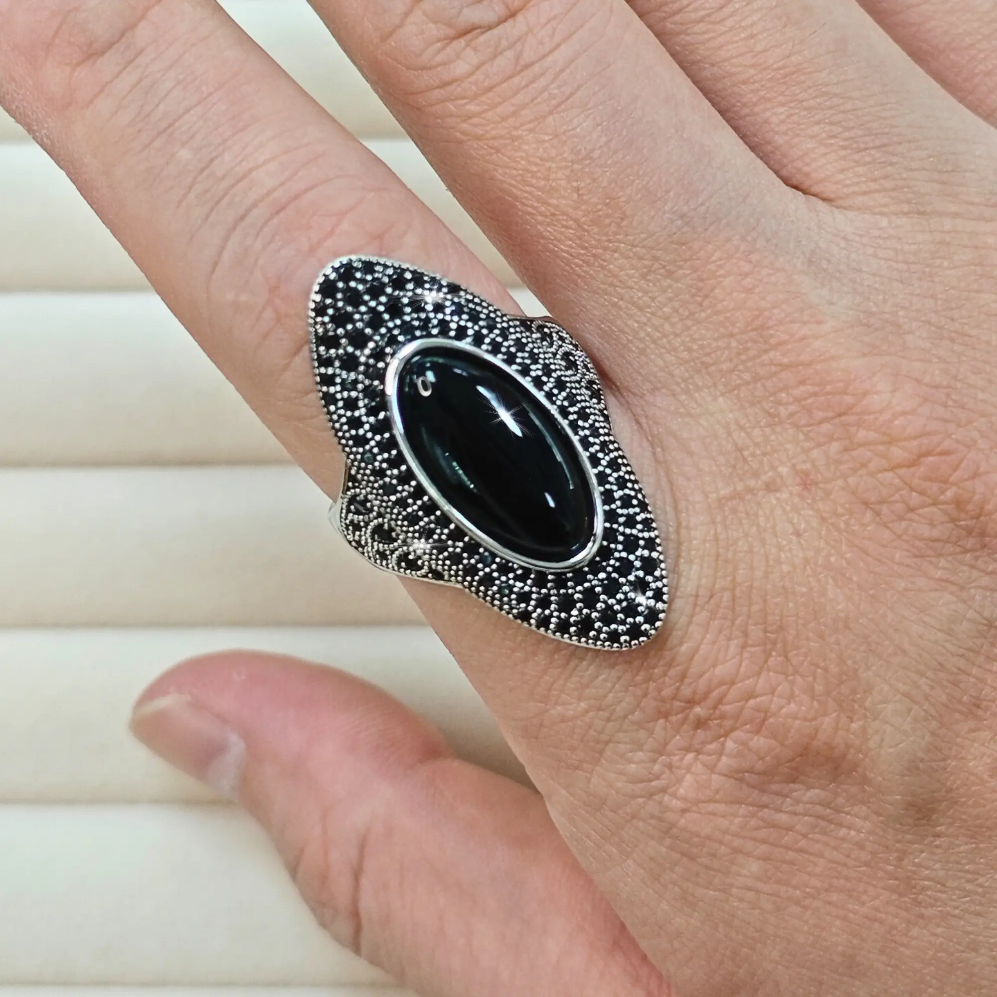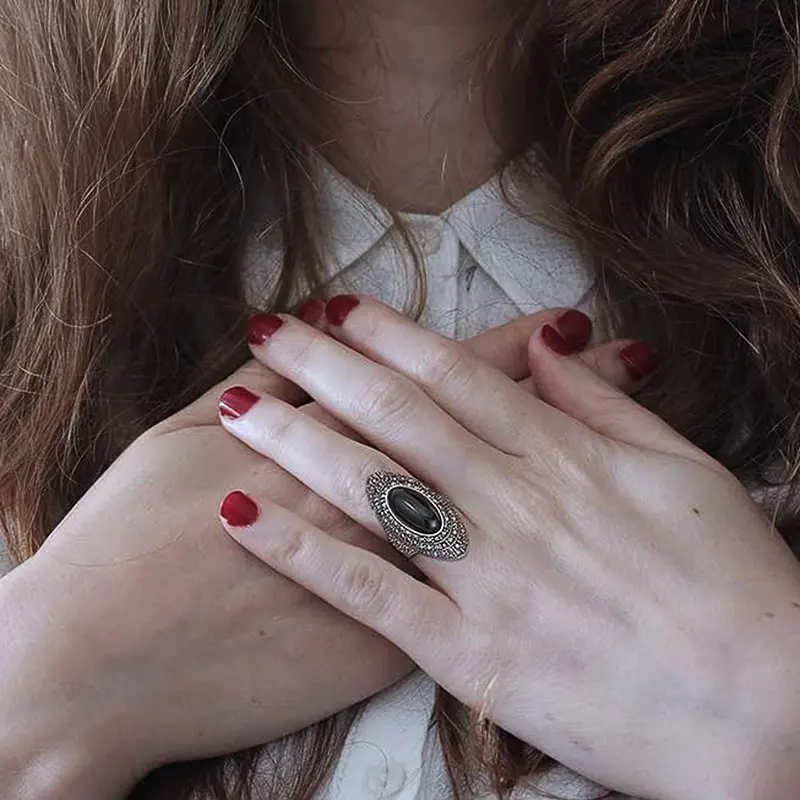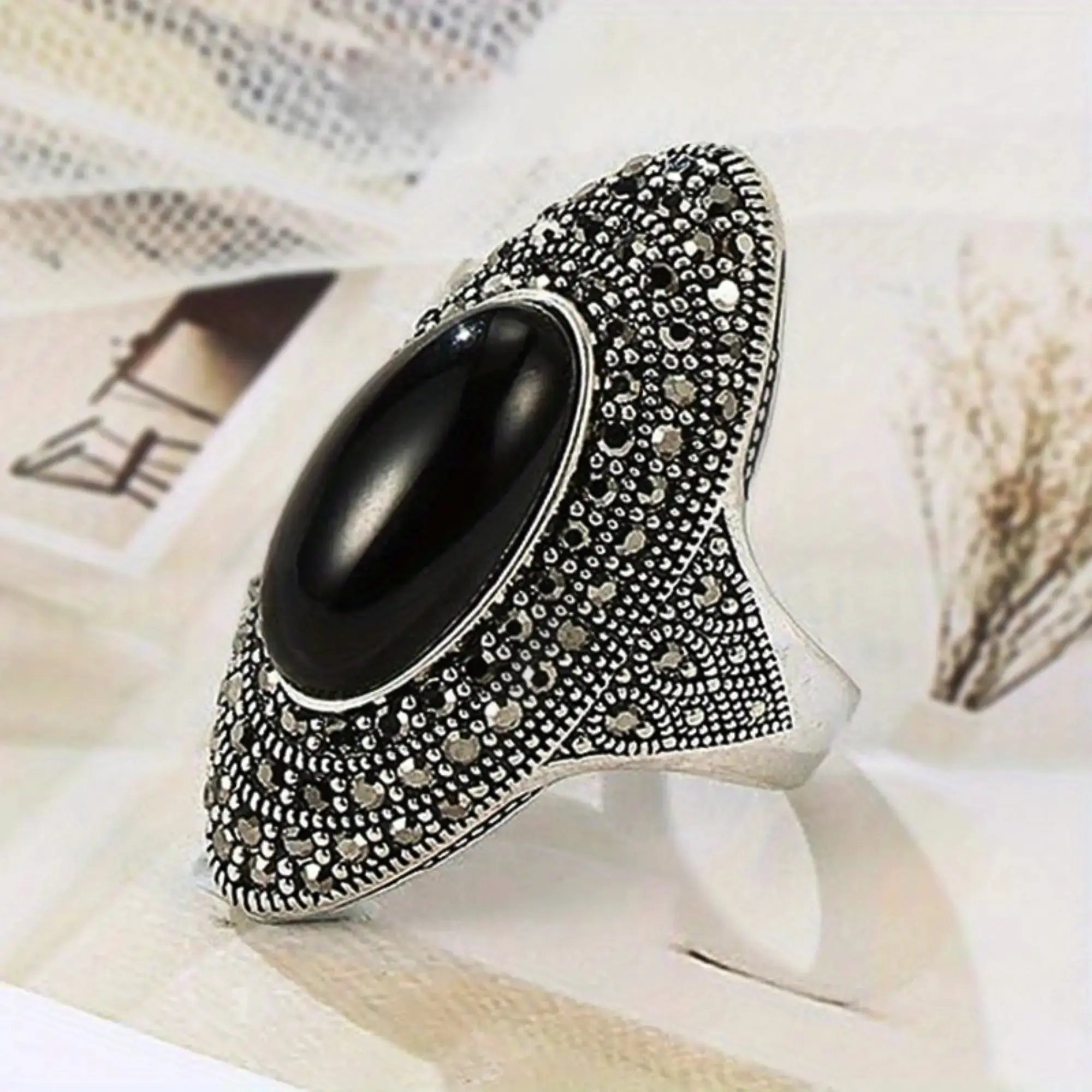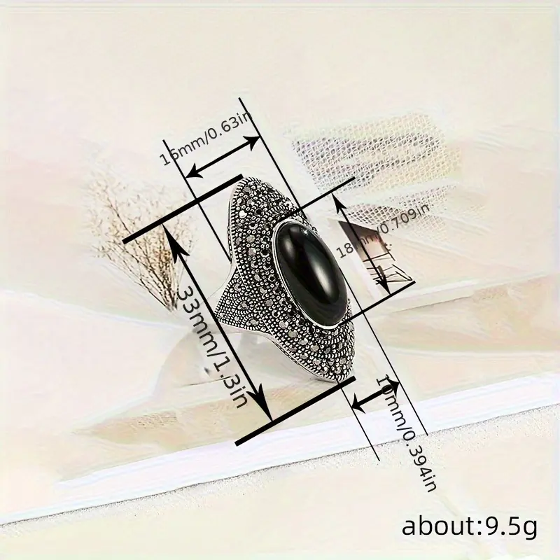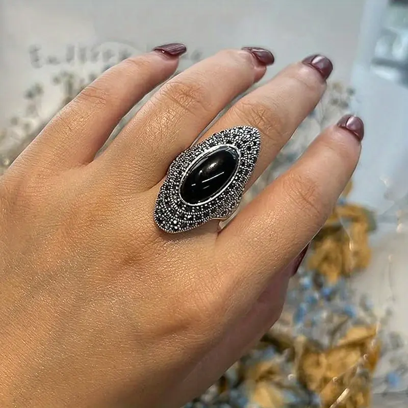 The ring includes a big black onyx stone, making it a standout accessory. It belongs to Victorian jewelry, offering a timeless appeal. Enhance your look with this unique piece. The ring combines elegance with boldness, suitable for both casual and formal events.