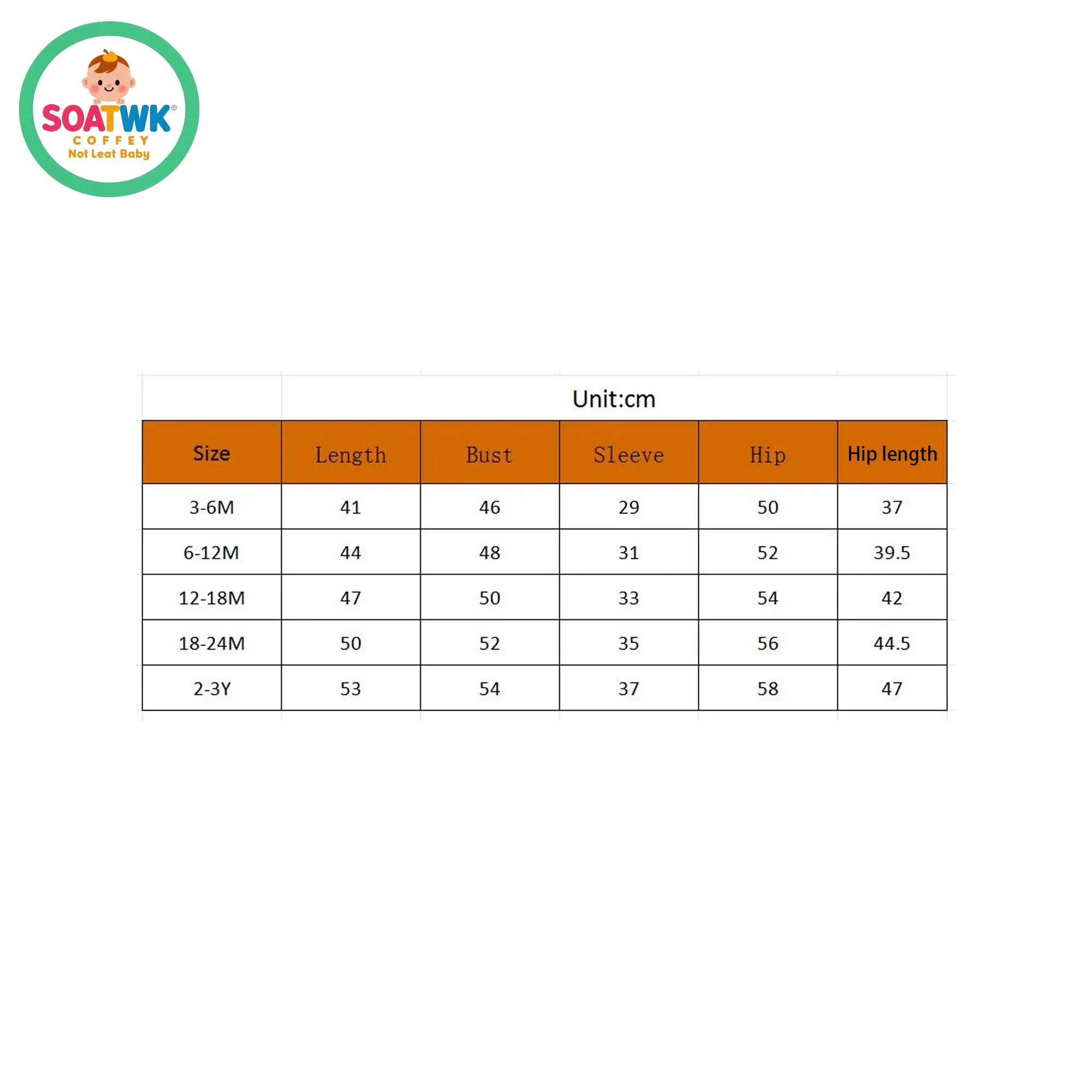 18-24M Length: 19.68 Bust: 20.47 Sleeve: 13.78 Hip: 22.05 Advised Age: 18-24 Months