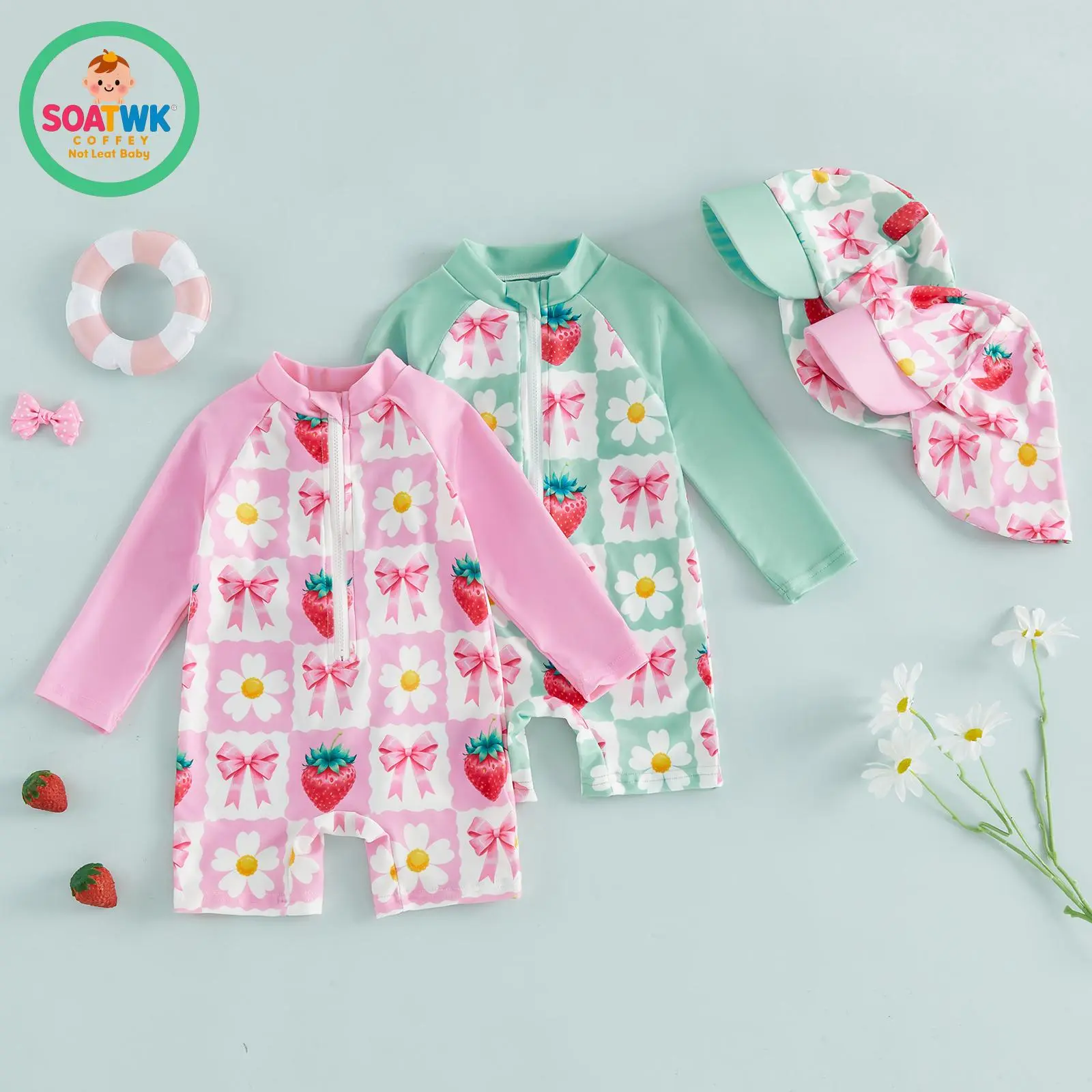Strawberry bow floral print, long sleeves, front zipper closure and crew neck, and swim cap set, will surely make your little baby stand out from the crowd; Little girl swimsuits are sweet and cute summer beachwear for baby girl