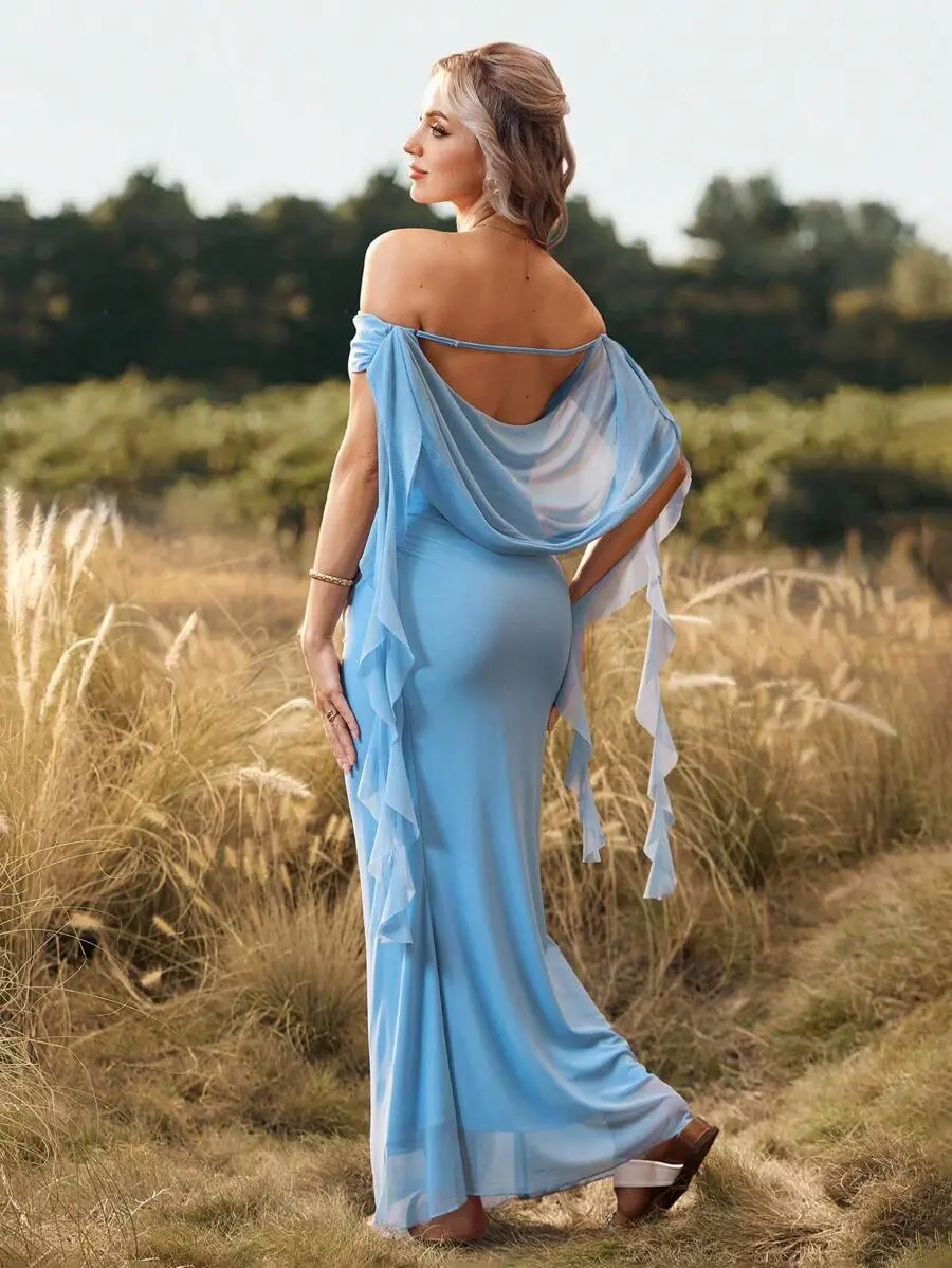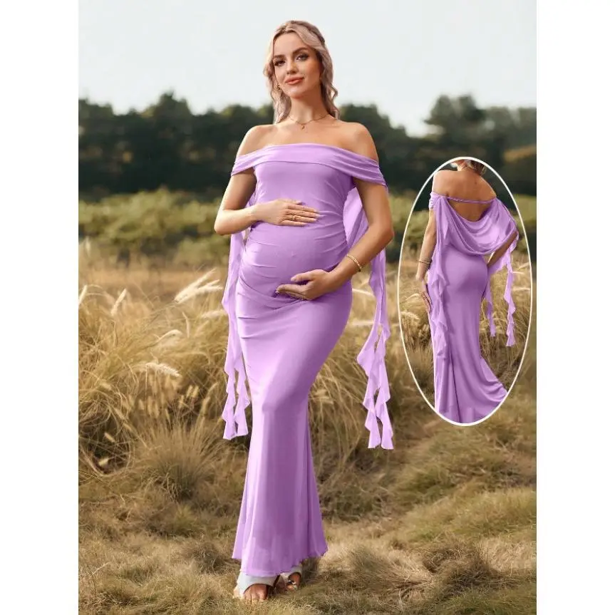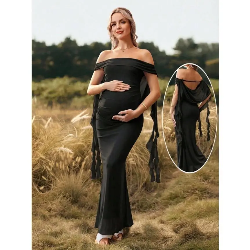 TAMALLA Maternity Solid Color Off-Shoulder Backless Maxi Maternity Dress For Baby Shower, Christmas Party, Elegant Party