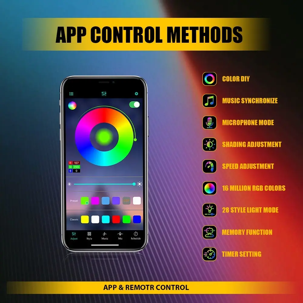 Use the APP to control, there are RGB 16 million colors and modes for you to choose and easy to operate.