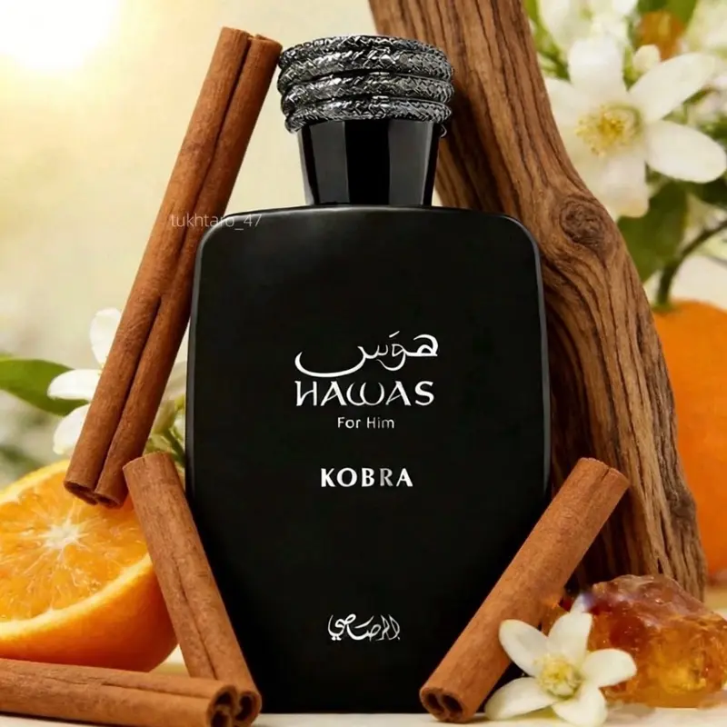 Hawas Kobra by Rasasi is a Oriental Woody fragrance for men. This is a new fragrance. Hawas Kobra was launched in 2025. Top notes are Ginger, Bergamot and Tangerine; middle notes are Cinnamon, Green Tea and Neroli; base notes are Musk, Woodsy Notes and Amber.