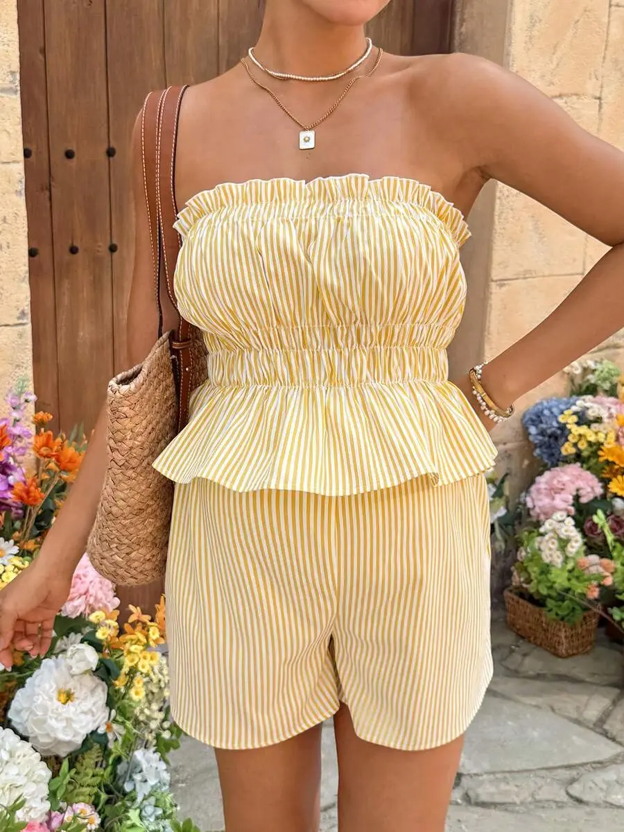ZENIE Yellow Lined Frill Margin Bandeau Flexible Midriff Hotpants Kit Sun Season Resort Wear Boho Chic