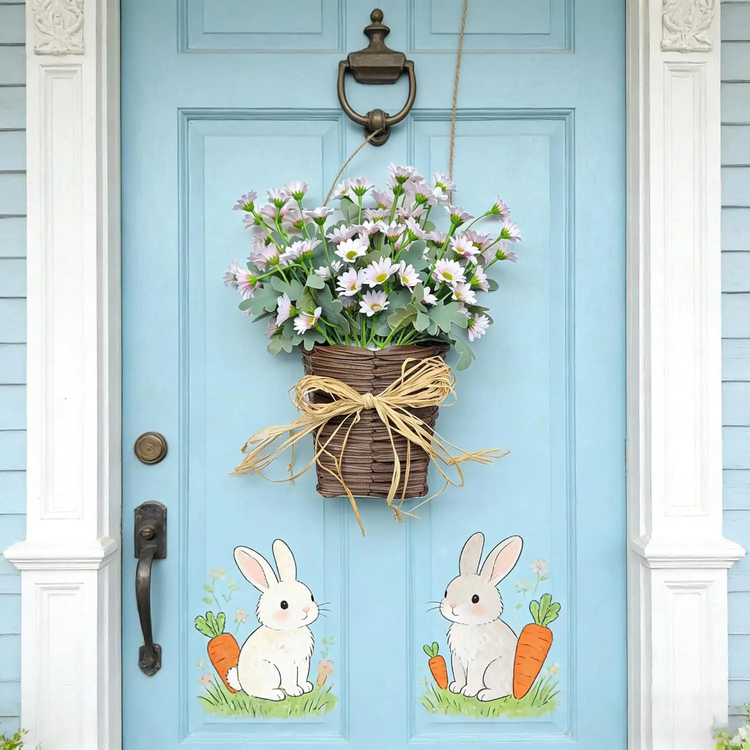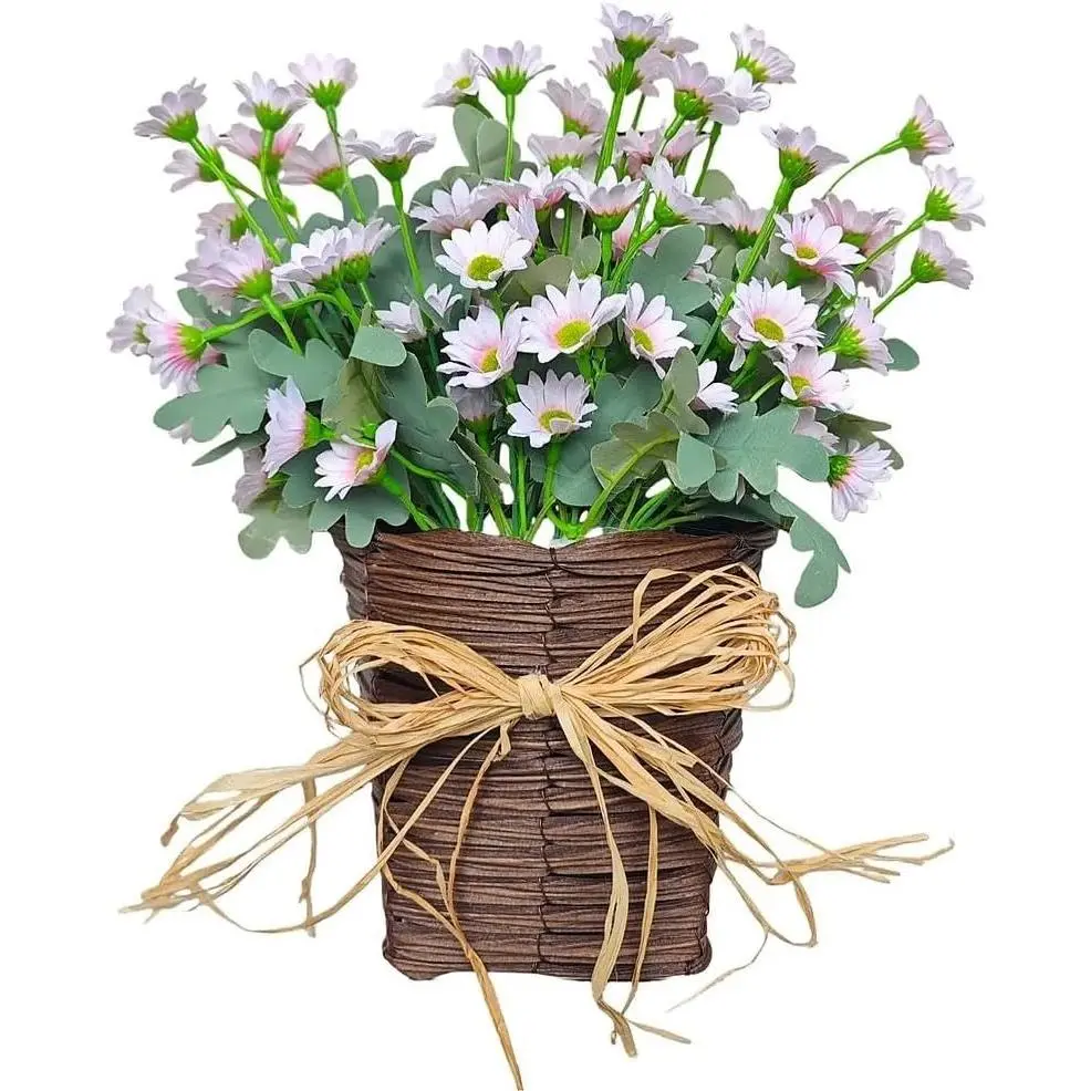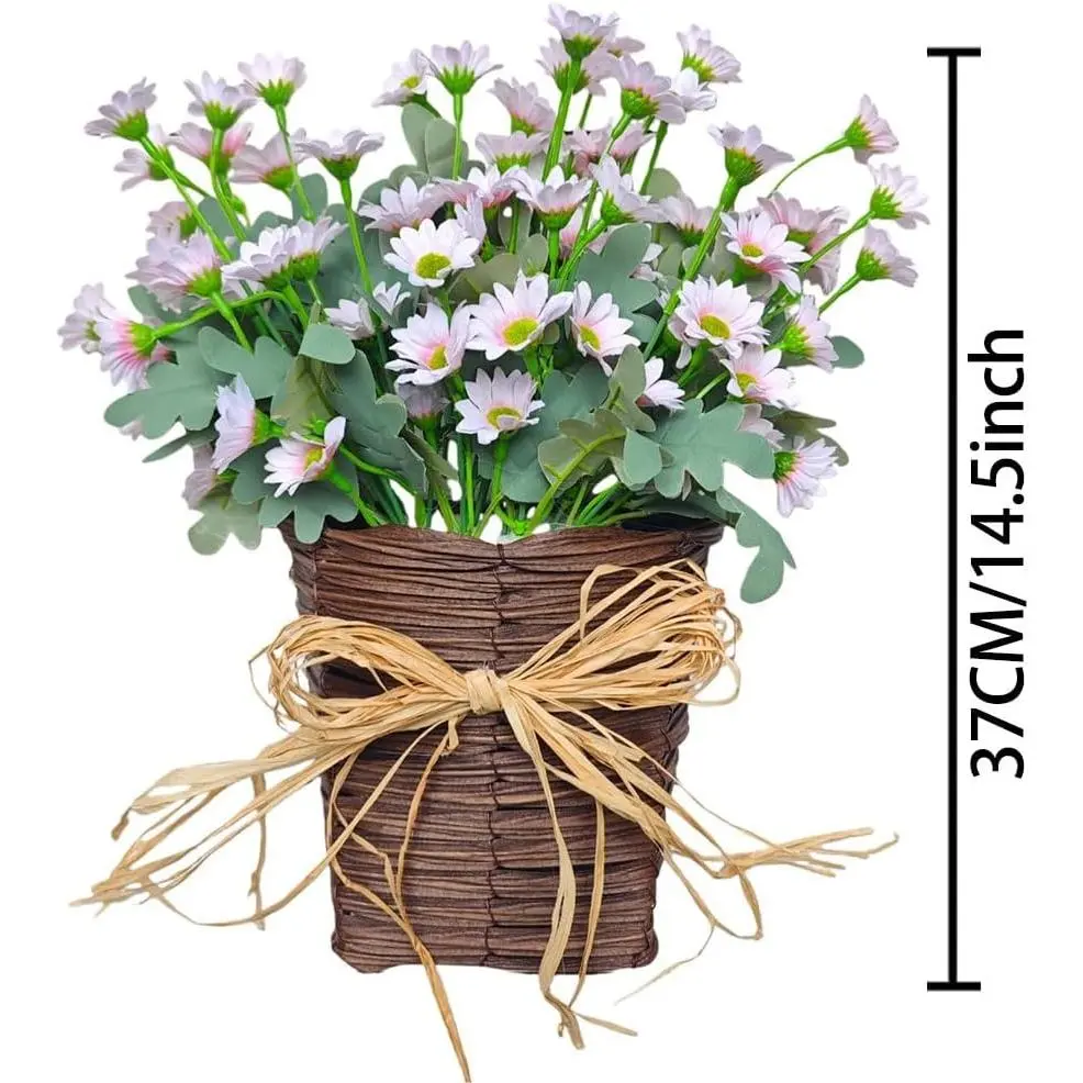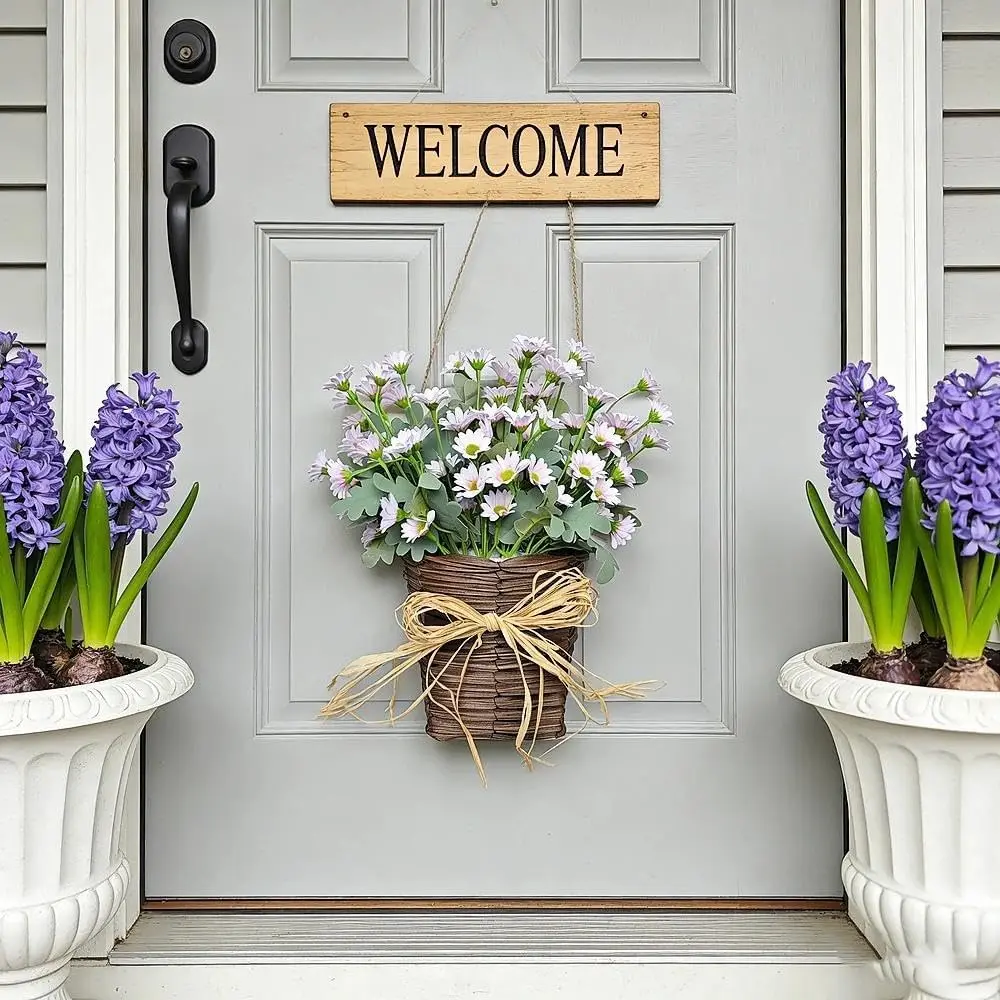 This front door basket wreath is a multi-functional styling piece. The realistic daisy and rustic burlap bow design transition seamlessly into farmhouse summer wreaths. It also doubles as a charming wall-mounted accent for cottage-style kitchens, weddings, or garden gates. Versatility meets style in this decorative piece.
