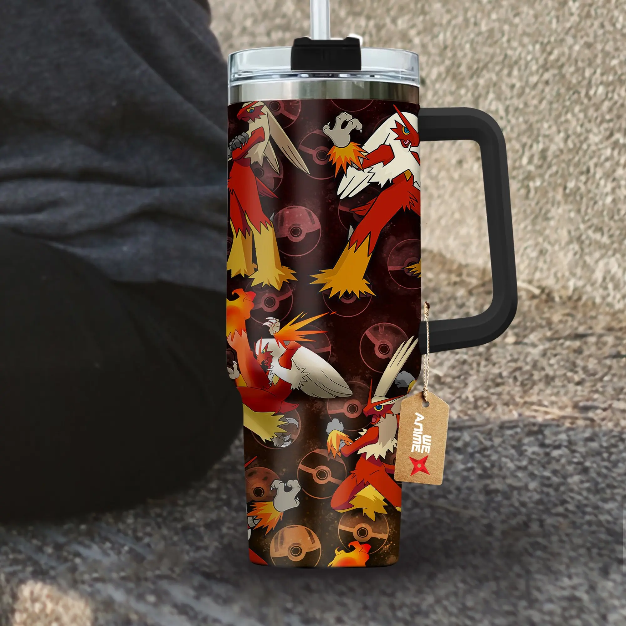 STORMMECH- Blaziken 40oz Handle Tumbler – PKM Stainless Steel Travel Mug, Anime Inspired Vacuum Insulated Cup, Large Iced Coffee Tumbler, Manga Fighter Drinkware, Otaku Gift for Him Her