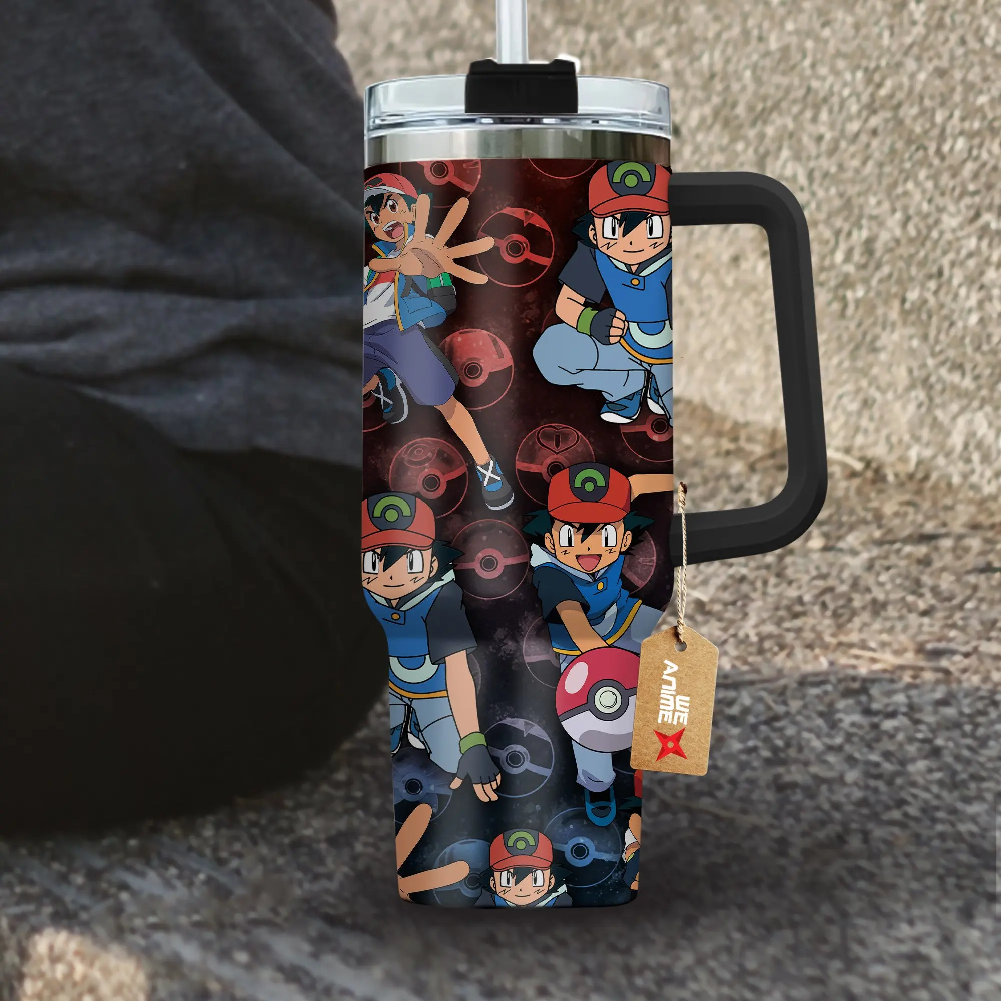 5. STORMMECH- Satoshi Ash KetChum 40oz Handle Tumbler – PKM Stainless Steel Travel Mug, Anime Inspired Vacuum Insulated Cup, Large Iced Coffee Tumbler, Manga Fighter Drinkware, Otaku Gift for Him Her