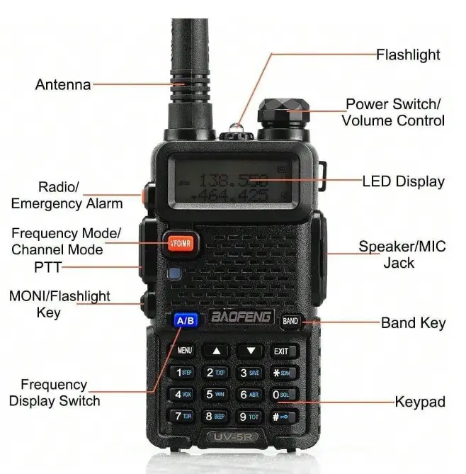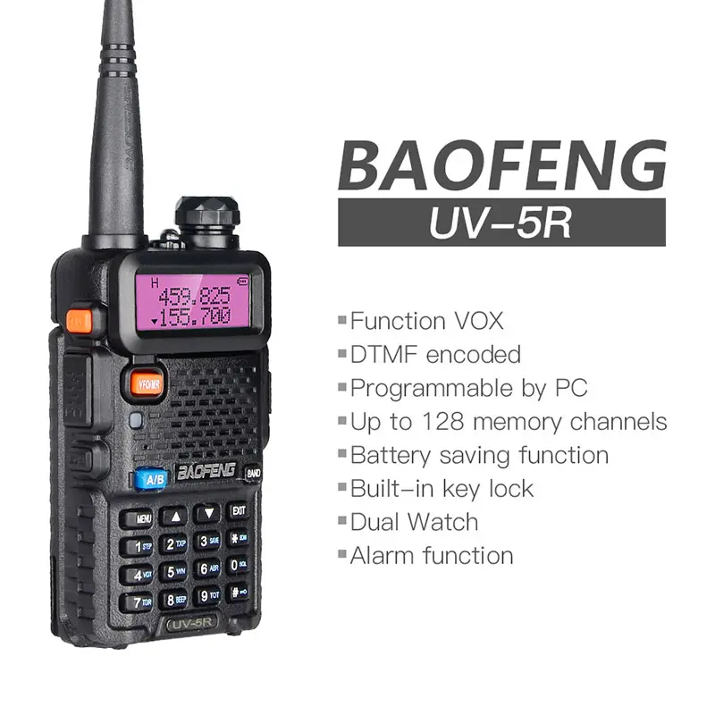 ·High/Low TX power selectable: Busy channel lock-out(BCLO),128 Channels 50 CTCSS and 104 CDCSS Dual-Band Display, Dual Freq. Display, Dual-Standby, A/B band independent operation, Keypad Lock. Voice companding: 50 CTCSS/ 104 DCS coder & tone searching, Tri-color background light selectable: 0-9 grades VOX selectable. Large LCD Display, Emergency Alert: 12.5KHz Switchable, LED Flashlight: High/Low RF Power Switchable, Support manually program. Easy to program via PC. Support CHIRP quick programming