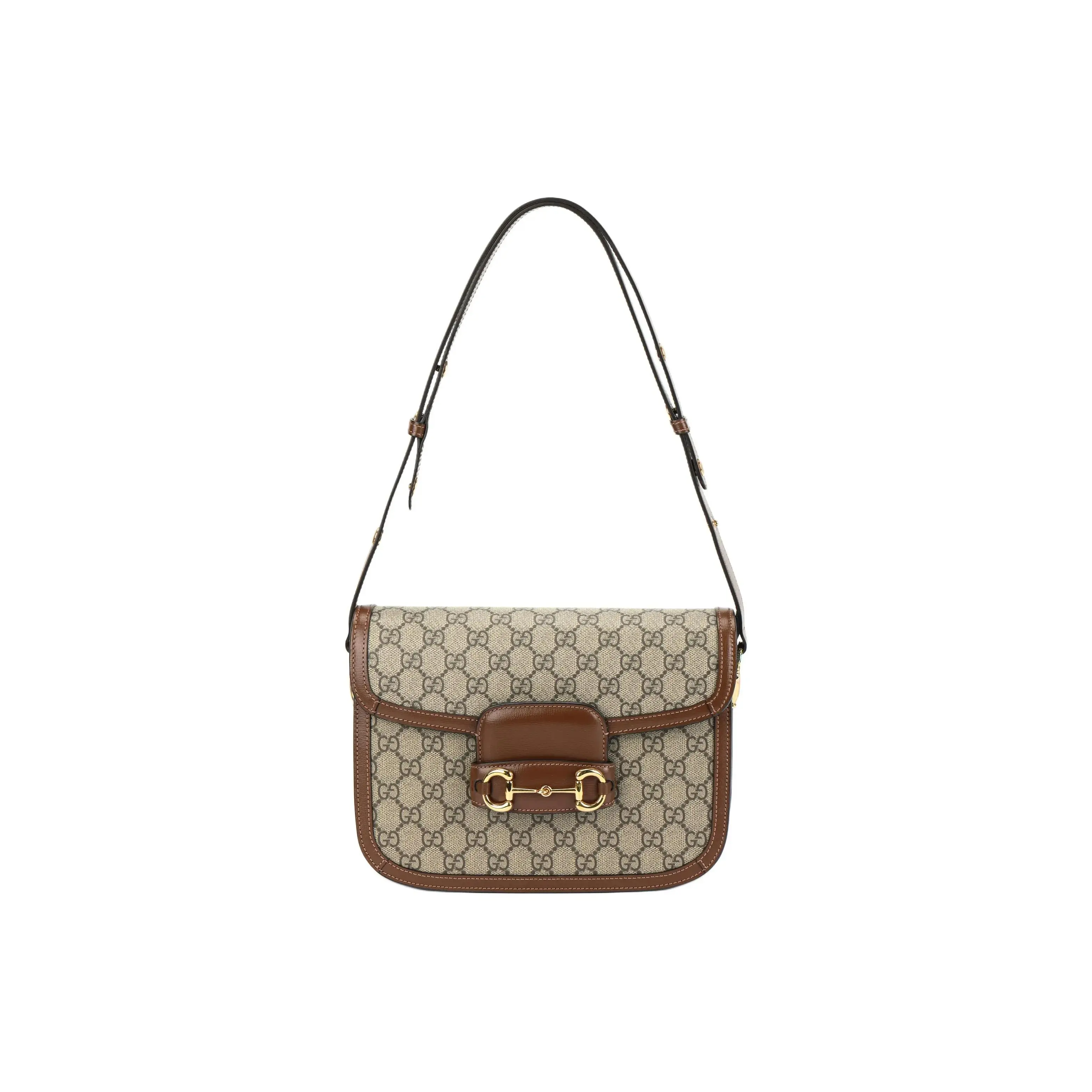 Discover the Horsebit 1955 Medium Shoulder Bag, a stylish blend of beige and ebony. This bag features GG Supreme spliced leather, offering a unique aesthetic. Perfect for those who appreciate designer accessories, it combines functionality with elegance. The saddle bag design adds a touch of sophistication to any outfit.