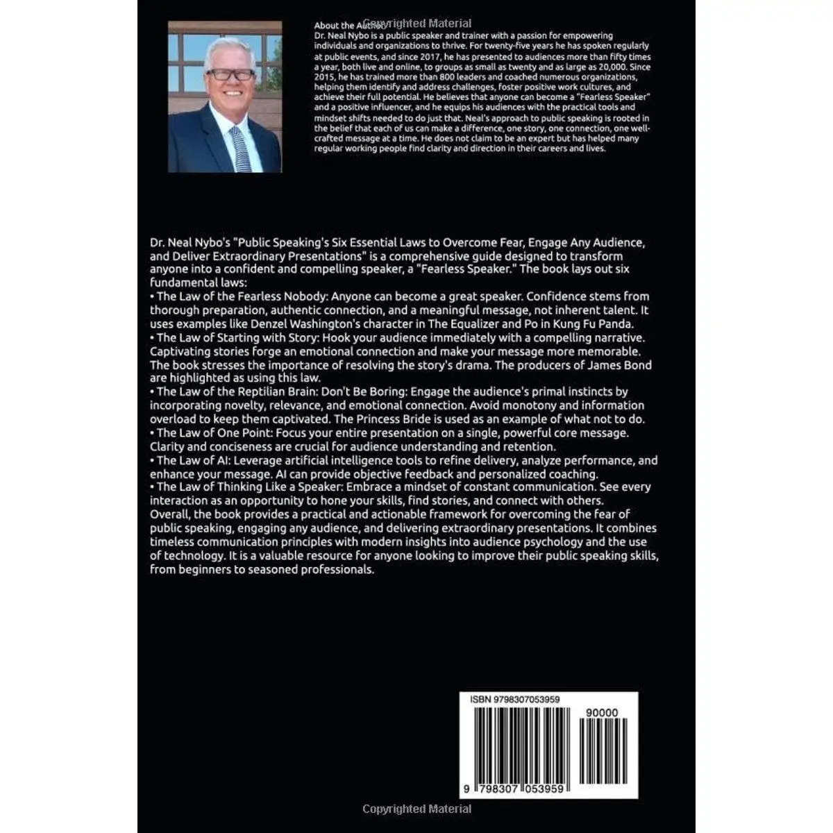 Dr. Neal Nybo's "Public Speaking's Six Essential Laws to Overcome Fear, Engage Any Audience, and Deliver Extraordinary Presentations" is a comprehensive guide designed to transform anyone into a confident and compelling speaker, a "Fearless Speaker." The book lays out six fundamental laws: