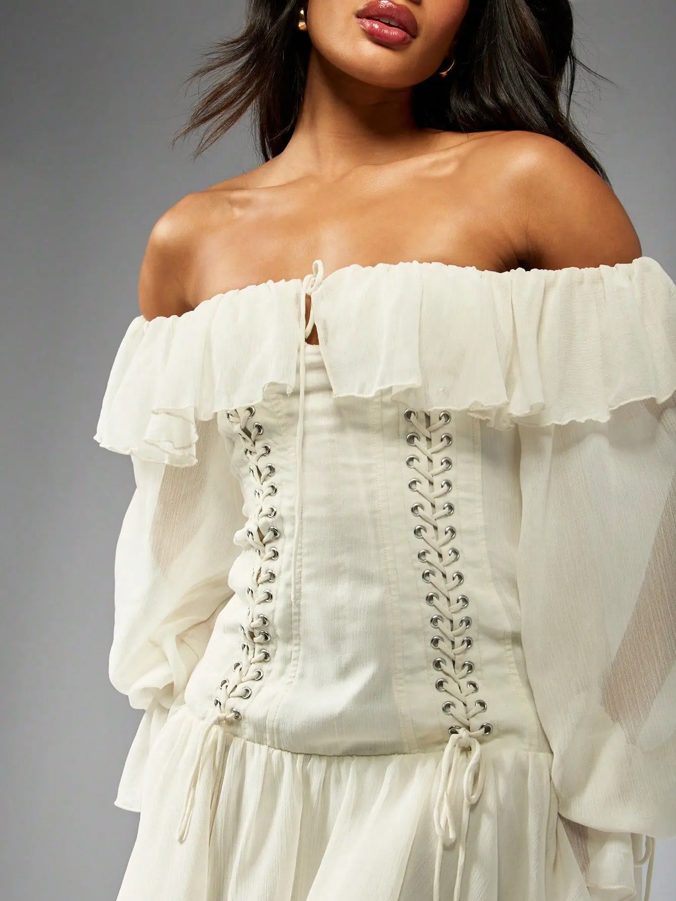 Ruffle Off Shoulder Long Sleeve Corset Chiffon Lace Up Detail Mini Dress