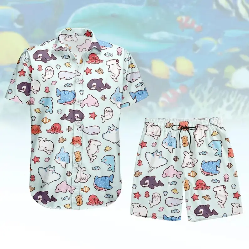 5. Cute Ocean Animals Hawaiian Matching Set Men Women Kawaii Whale Shark Dolphin Octopus Starfish Print Loose Casual Beach Shorts Shirt Summer Outfit