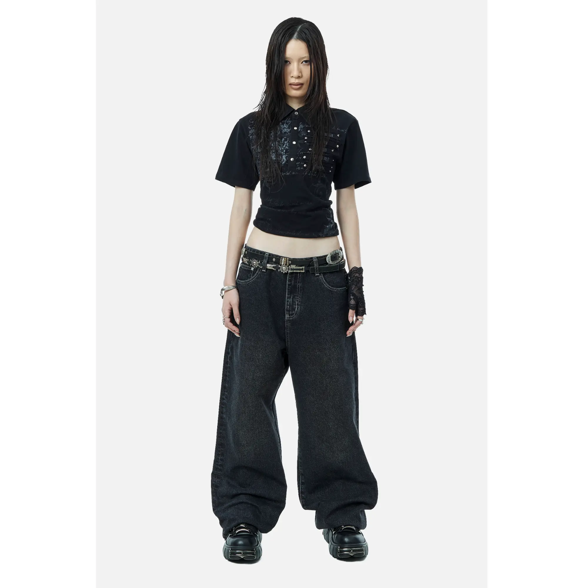 Definitely bigger on the top and more fitted around the ribs and waist area. Super great and soft material! Durable. The rhinestones and design are super pretty.