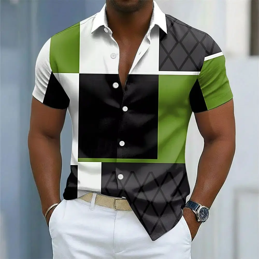 Men'S Color Block Patchwork Shirt Button up Short Sleeve Casual Streetwear 3D Print Turndown Shirt Blue Wine Brown Green NONE