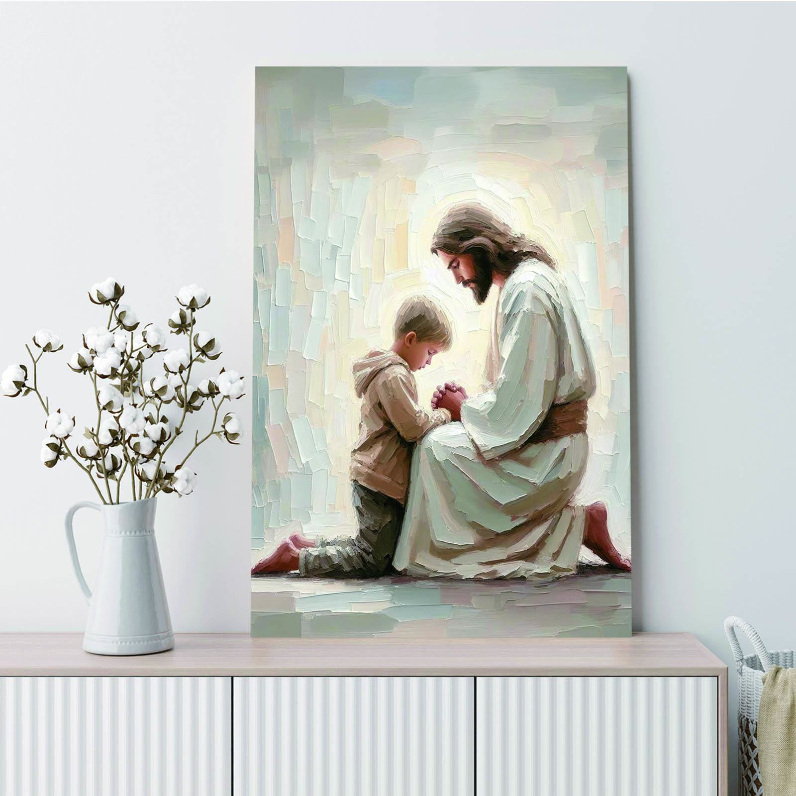 Jesus and Little Boy Praying Poster - Bible Oil Painting Print for Living Room & Bedroom Decor - Retro & Y2K Style Wall Art - Calming Imagery for Home Decor - Religious Faith Artistic Depiction