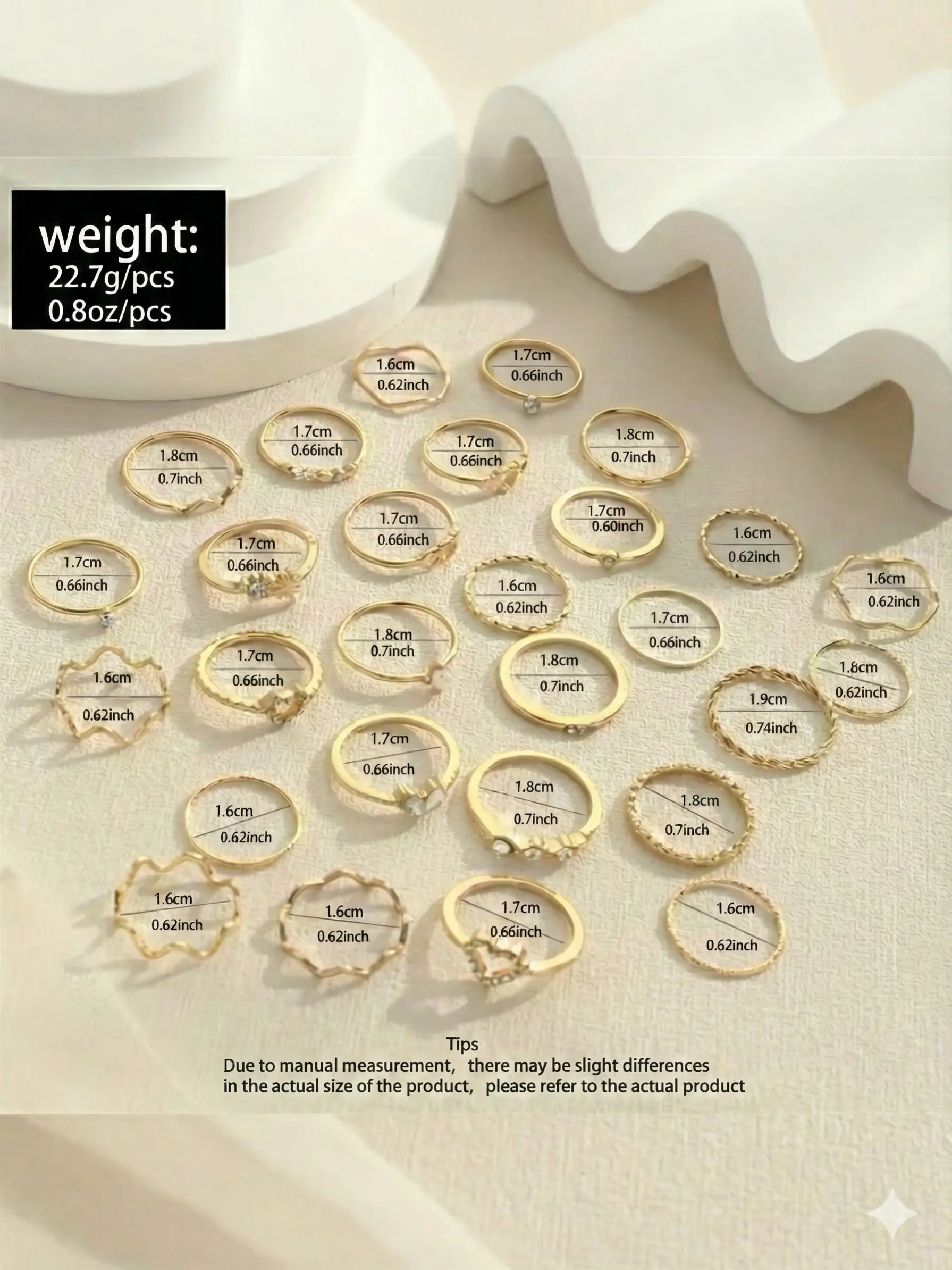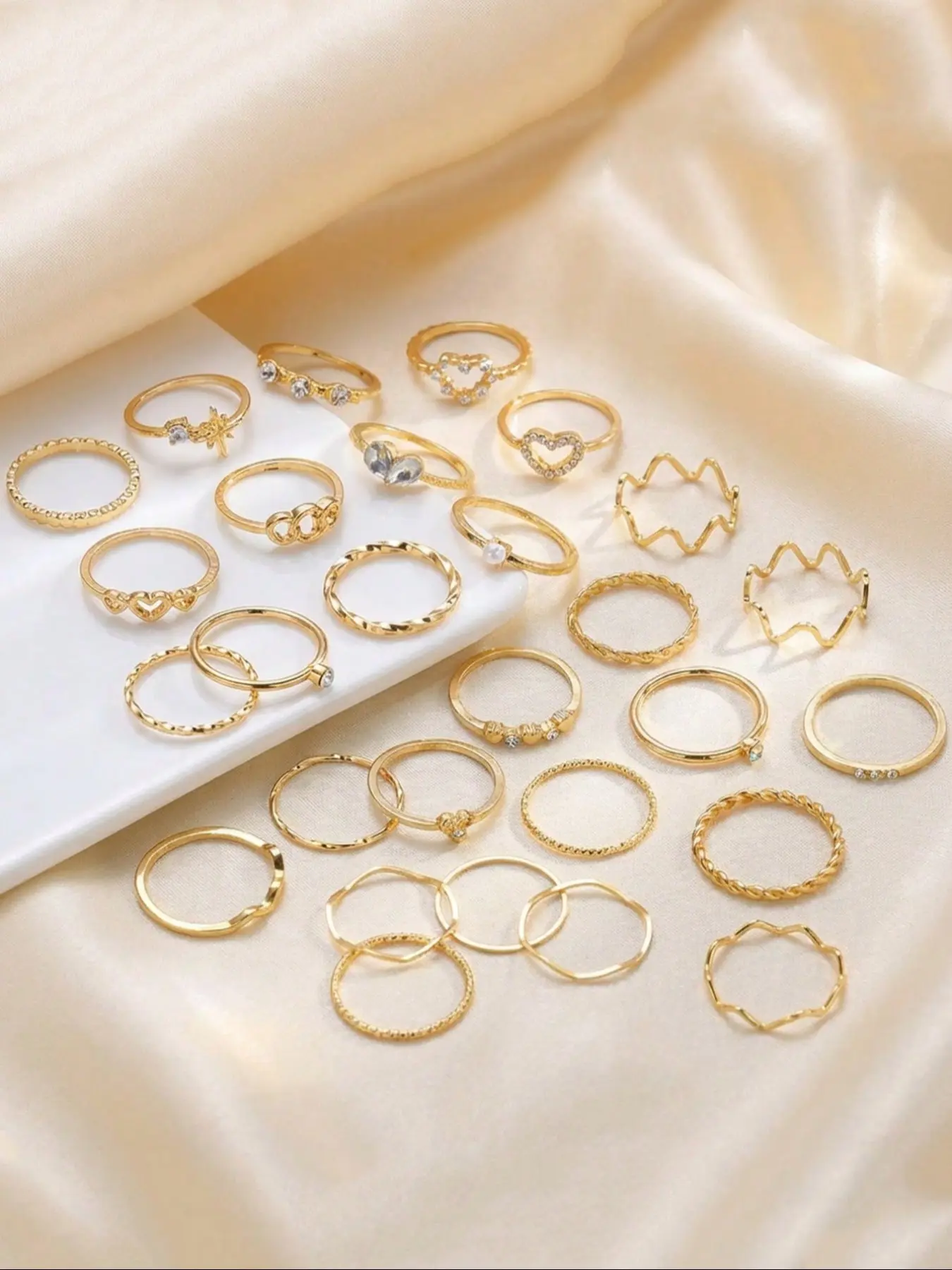 28pcs Heart Shaped Geometric Boho Style Rhinestone Knuckle Rings, Minimalist Wave Design, Perfect for Women's Daily Wear & Parties