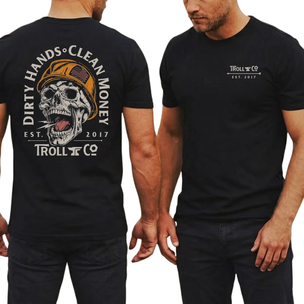 #TrollCo #DirtyHandsCleanMoney #SkullGraphicTee #ConstructionLife #BlueCollarPride #WorkwearStyle #MensGraphicTee #2SidesTShirt #HardHatLife #GiftForWorkers #StreetwearMen #LaborLifestyle
