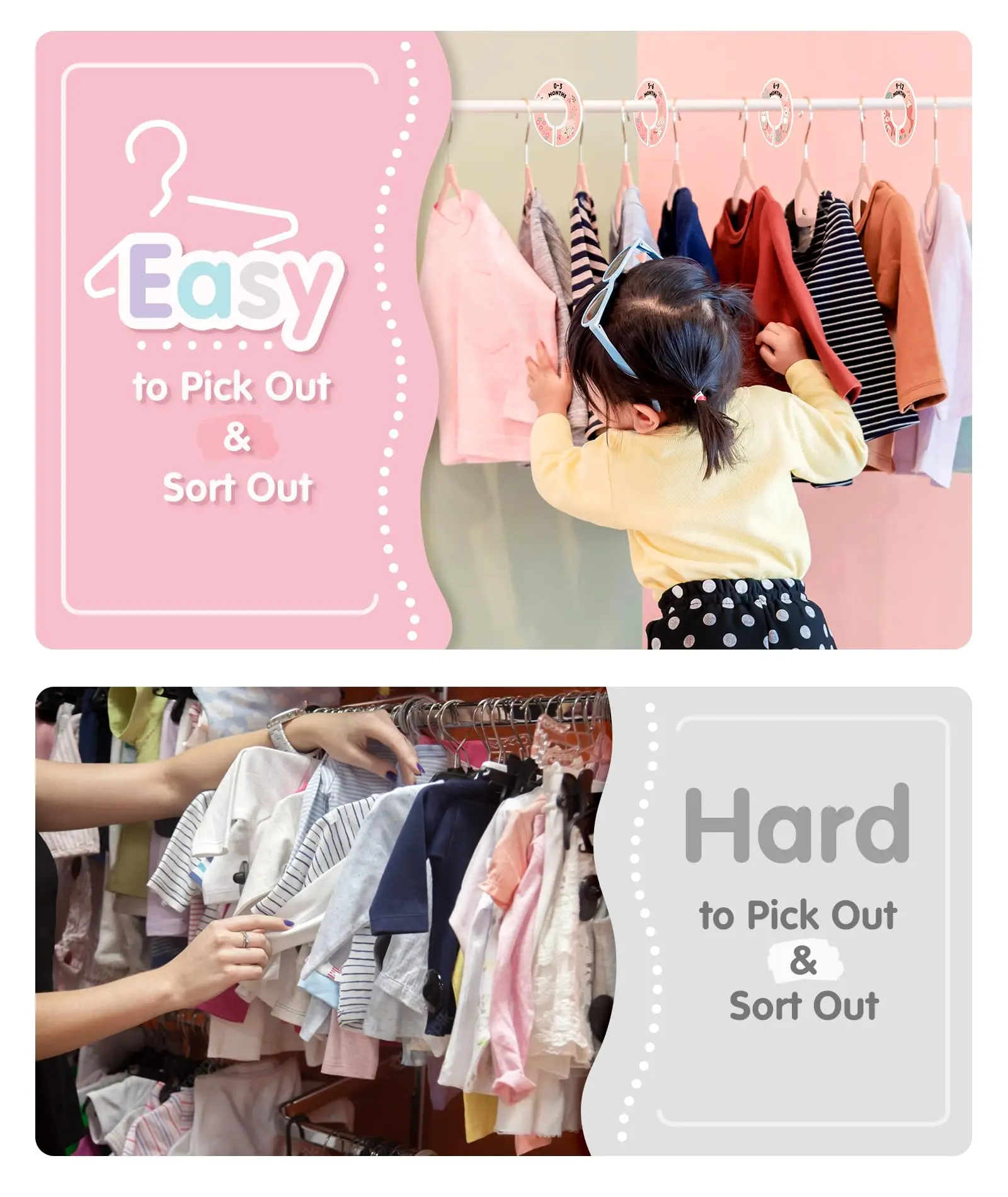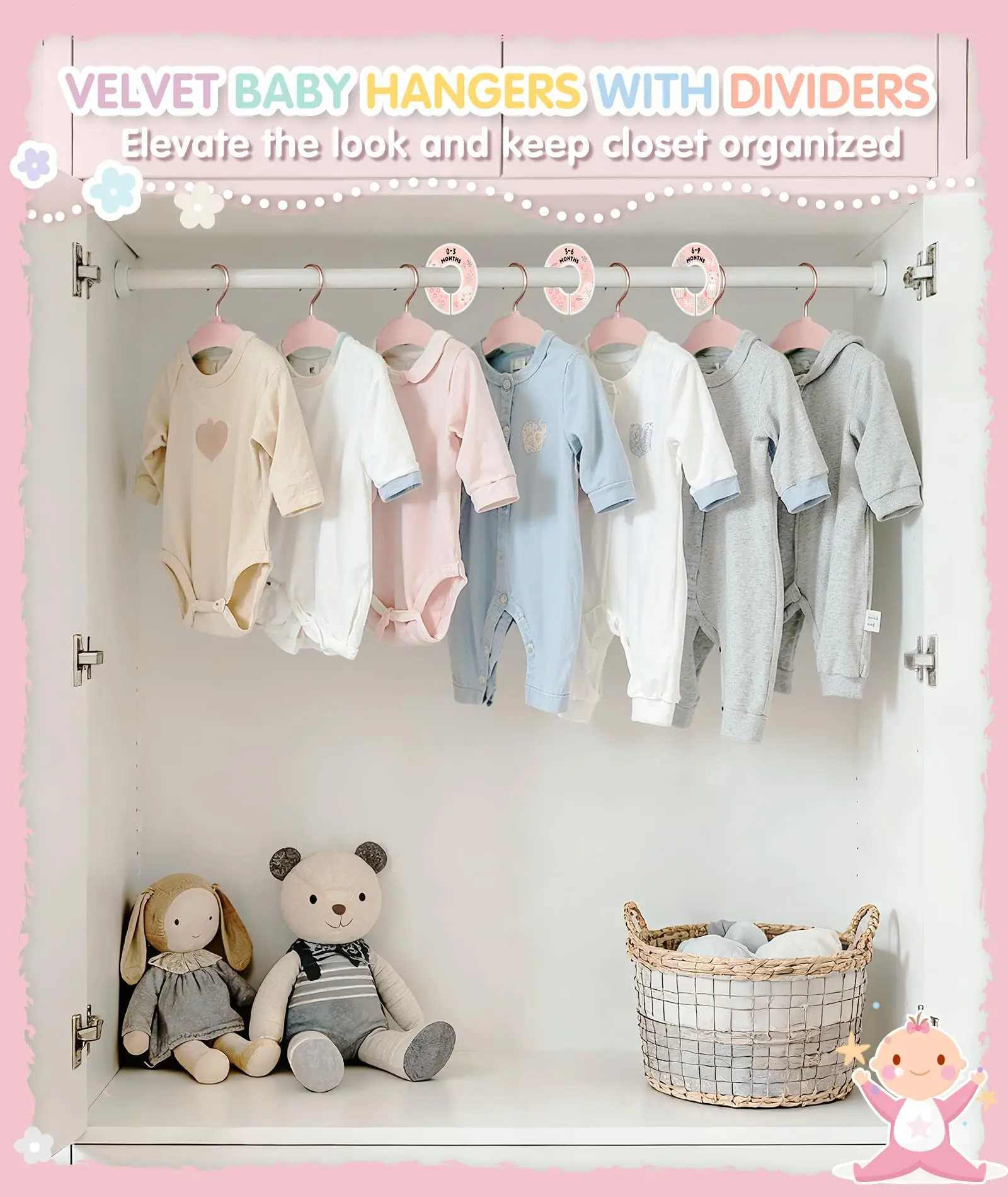 ·Clothes Size Dividers: Comes with 6 pcs cute clothing dividers with labeled dates from 0-24 months, easy to use with infant hangers; accordingly separate and sort out baby’s clothes in order by age or size, take less time to pick out the right one; great organizer in nursery and sweet baby shower gift for expectant parents as well
