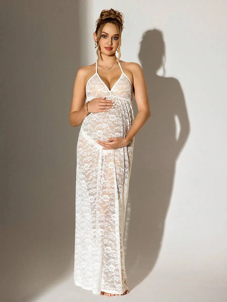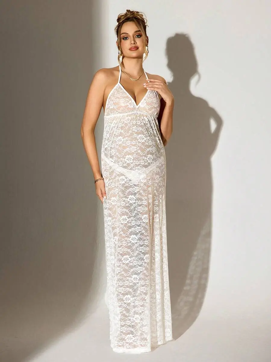 MISHELLA Maternity Sexy Sheer Lace White Backless Halter Dress For Holiday Party Clothes