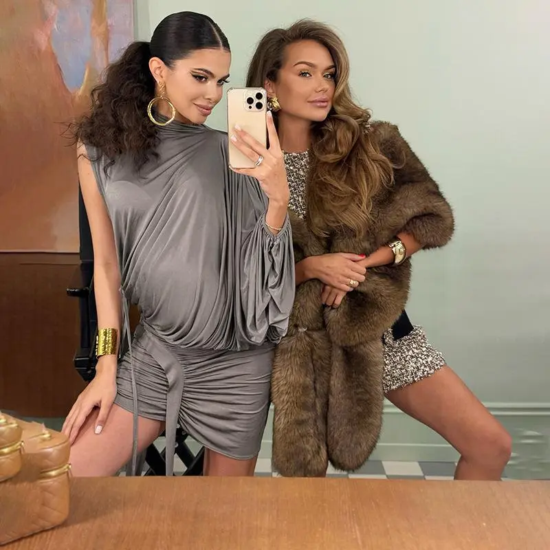 2026 Autumn New Women's Fashion Elegant Half-High Collar One-Shoulder Top with Hip-Hugging Pleated Irregular Skirt