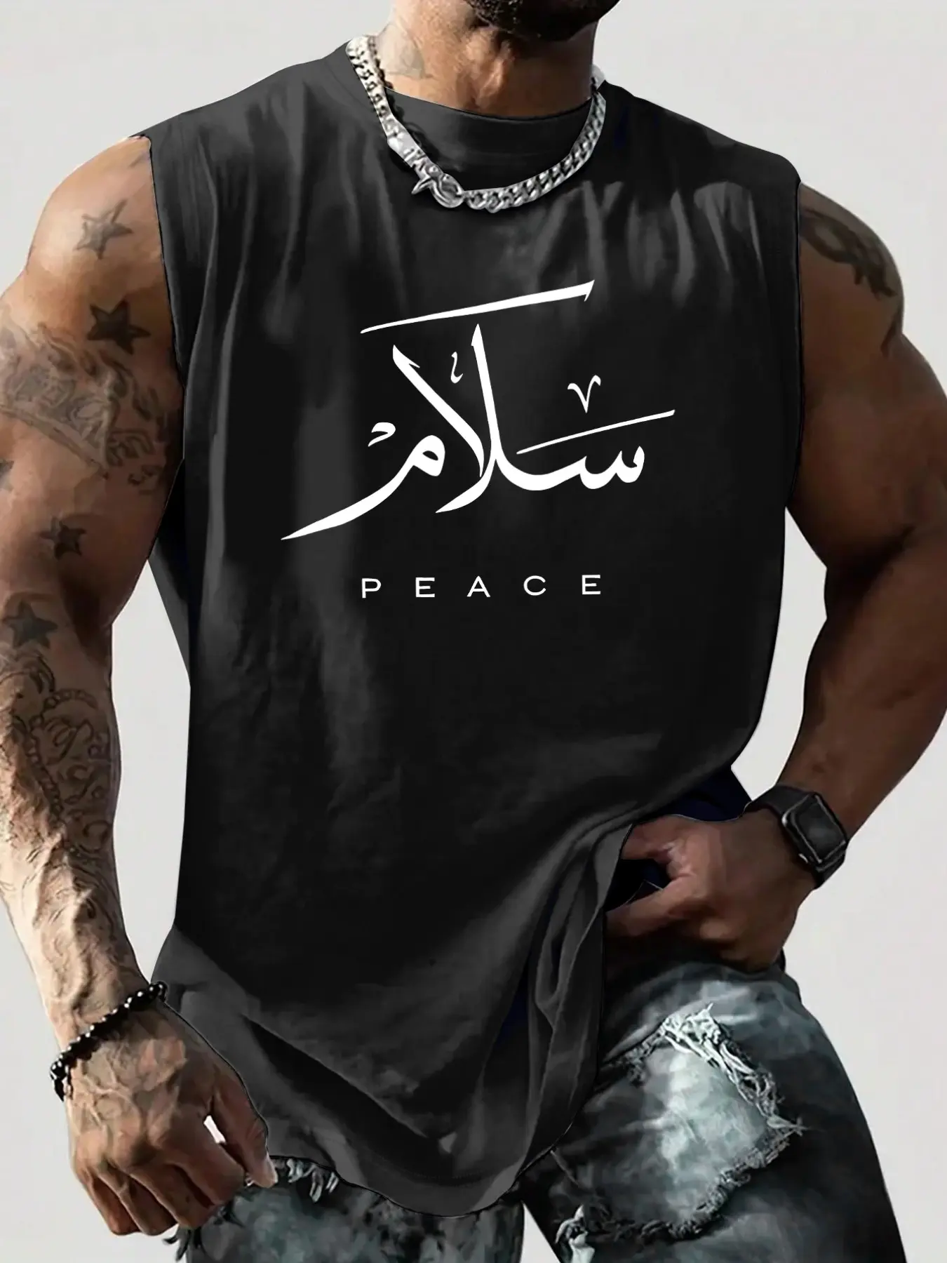 5. Men's Arabic Calligraphy "Peace" Graphic Sleeveless Tank Top, Islamic Style Casual Workout Vest, Streetwear Gym Fashion #IslamicClothing #ArabicCalligraphy #MensGymWear #SleevelessTank #TikTokMadeMeBuyIt
