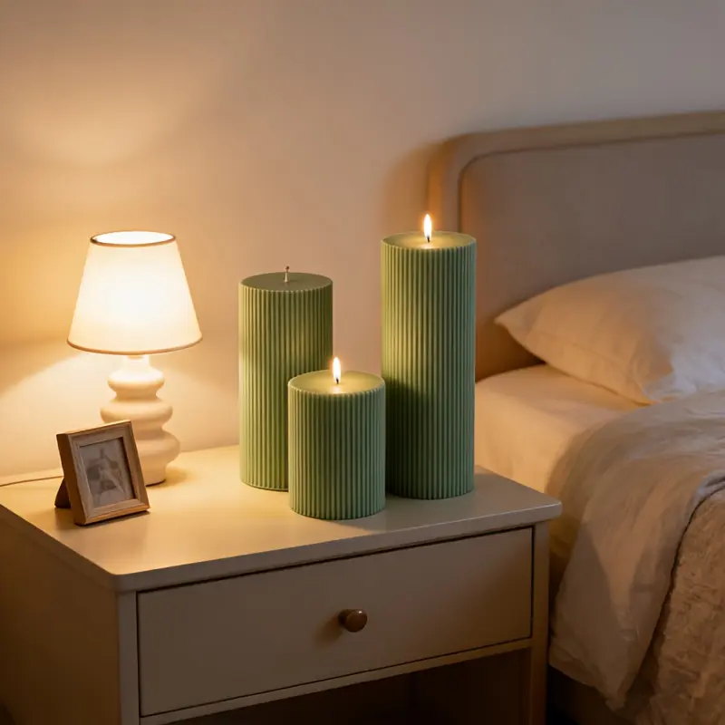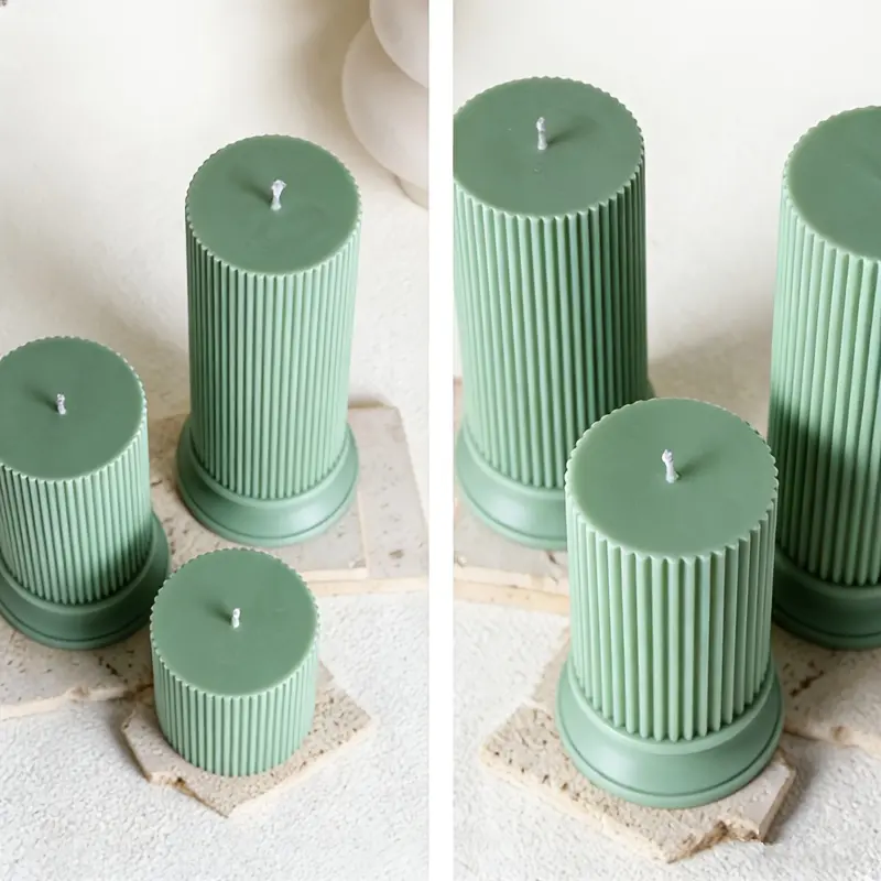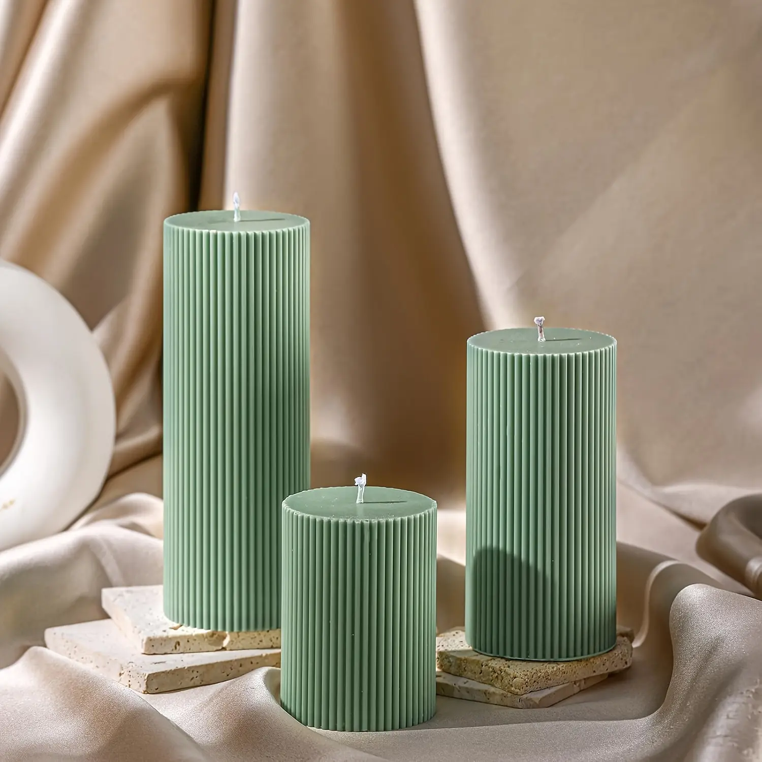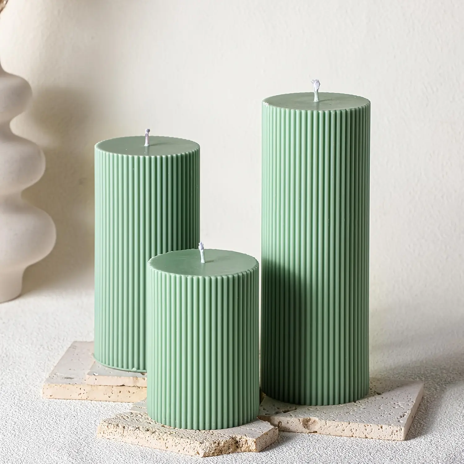 This set of 3 pillar candles features a sleek vertical ribbed texture in soft sage green. The minimalist, on-trend design adds a subtle sense of order and calm to any room, fitting perfectly with modern, Scandinavian, and Japandi decor styles.