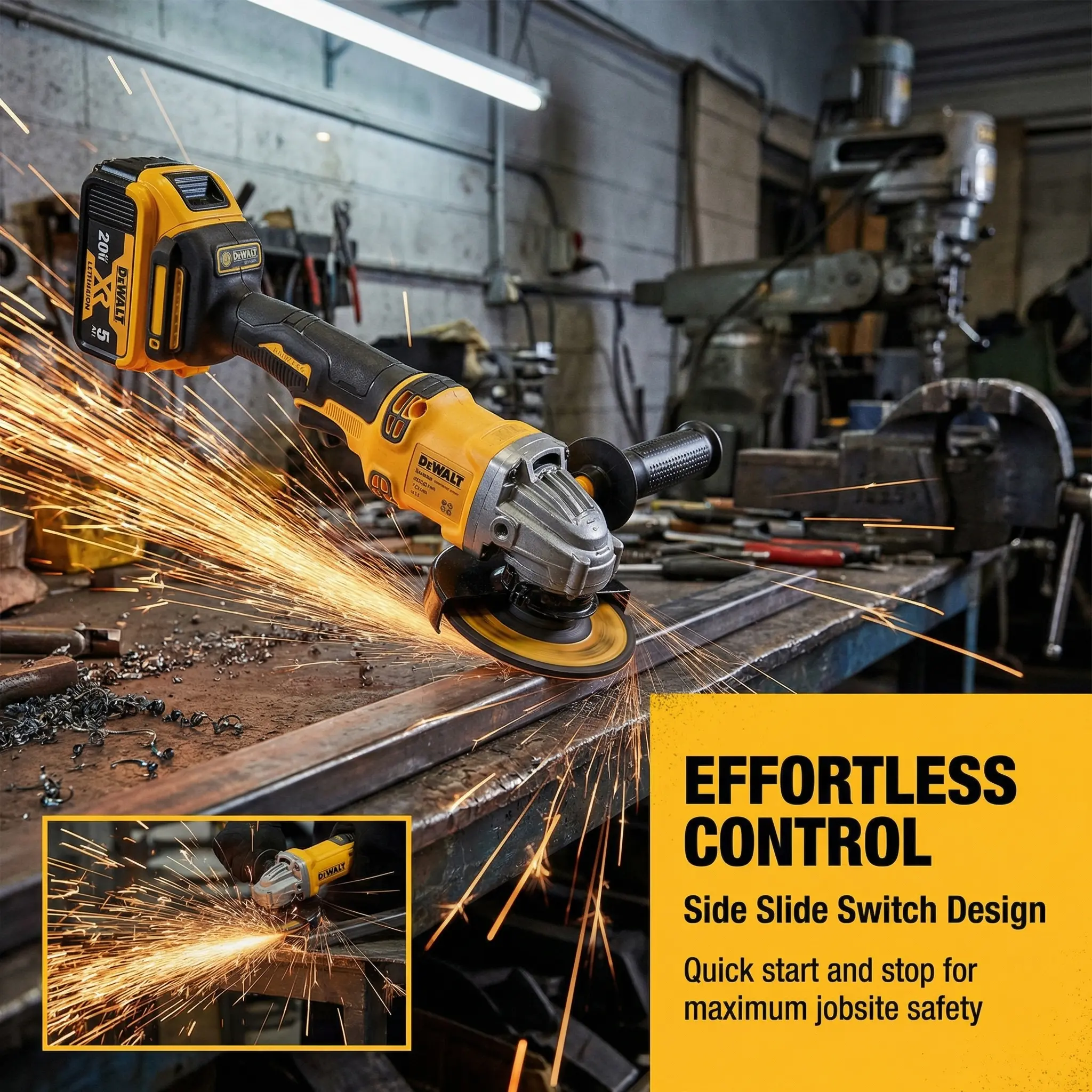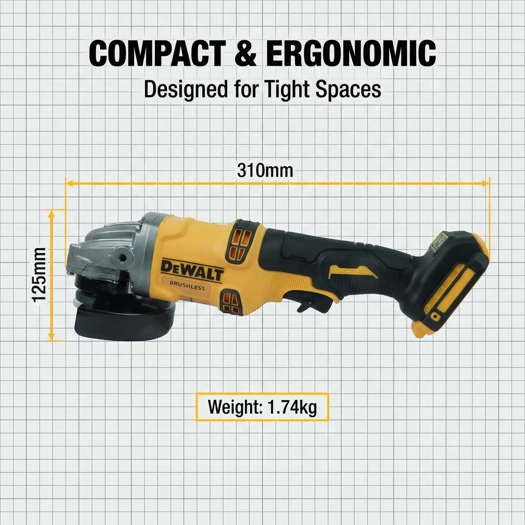 Equipped with a 20V lithium-ion battery, the grinder offers long-lasting performance and rapid recharging. Compatible with other Dewalt 20V tools.