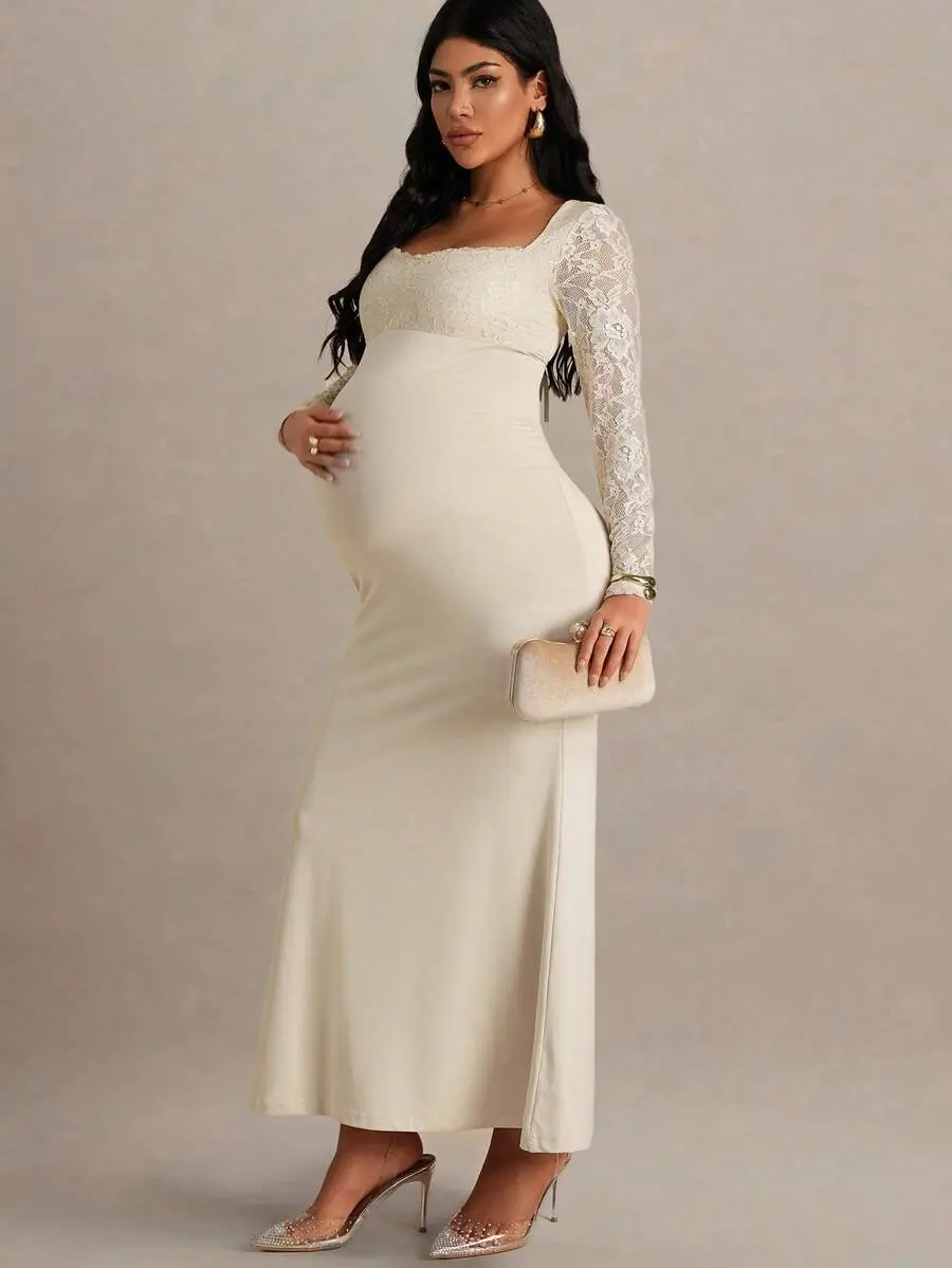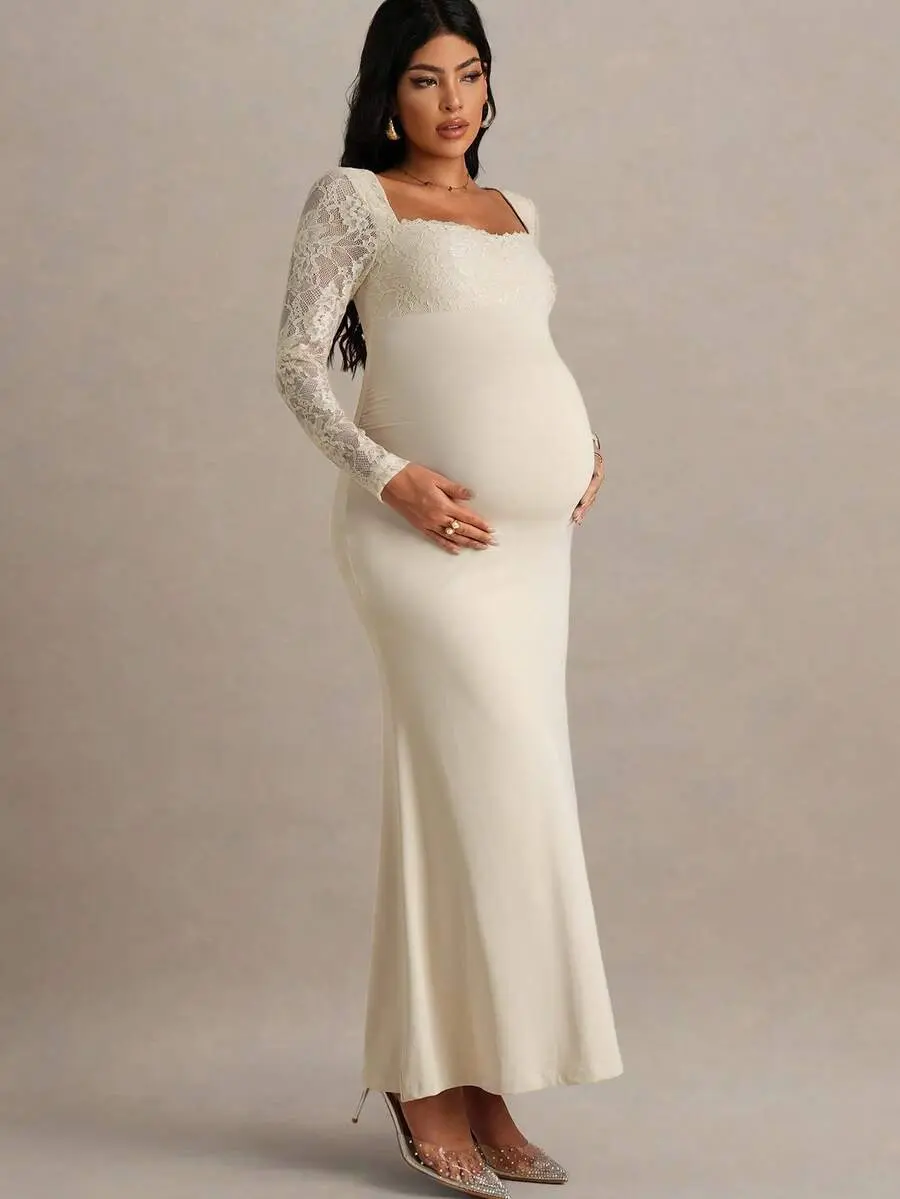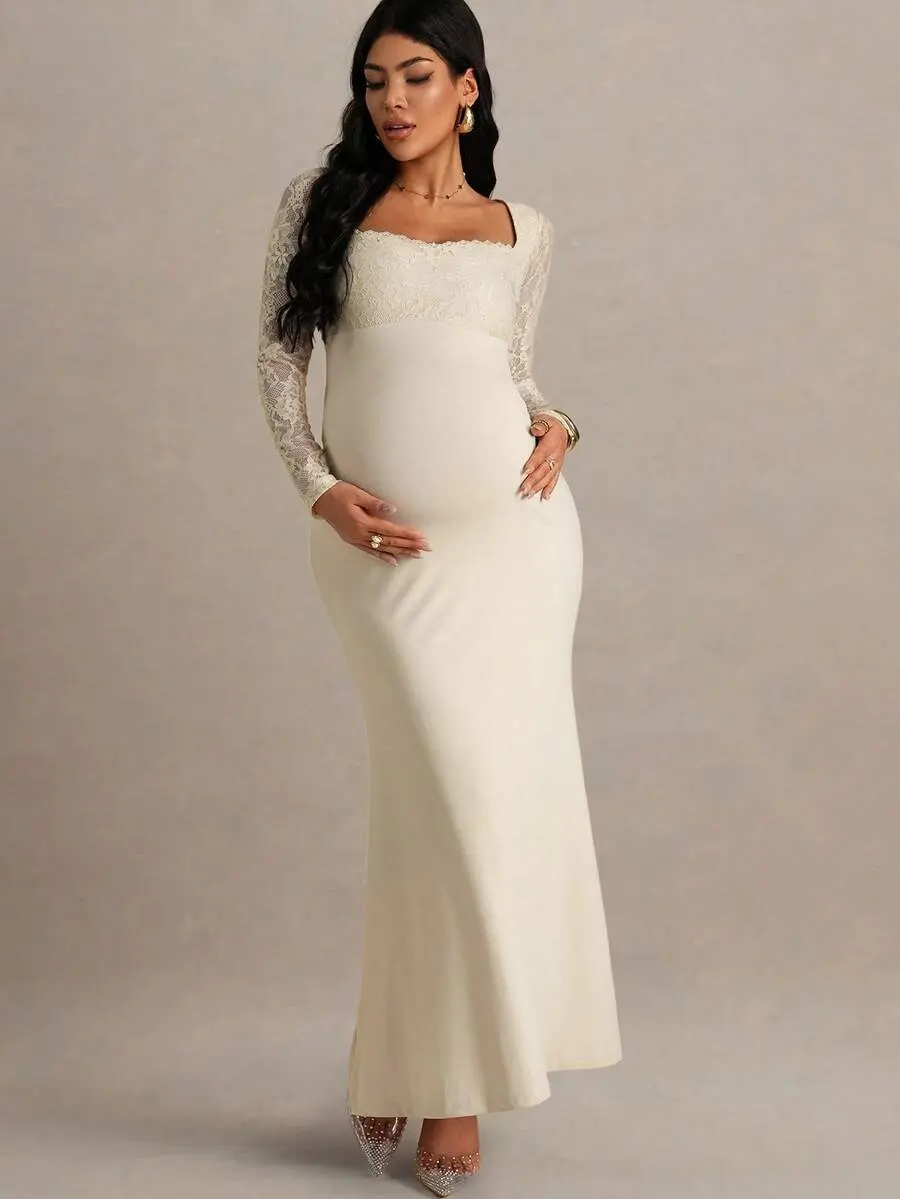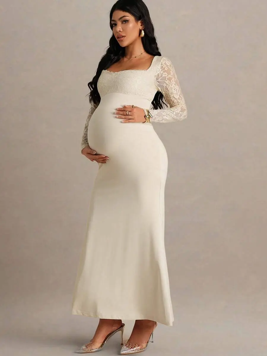 MISHELLA Elegant Contrast Lace Fishtail Hem Maternity Dress Autumn Maternity Gown For Photoshoot Wedding