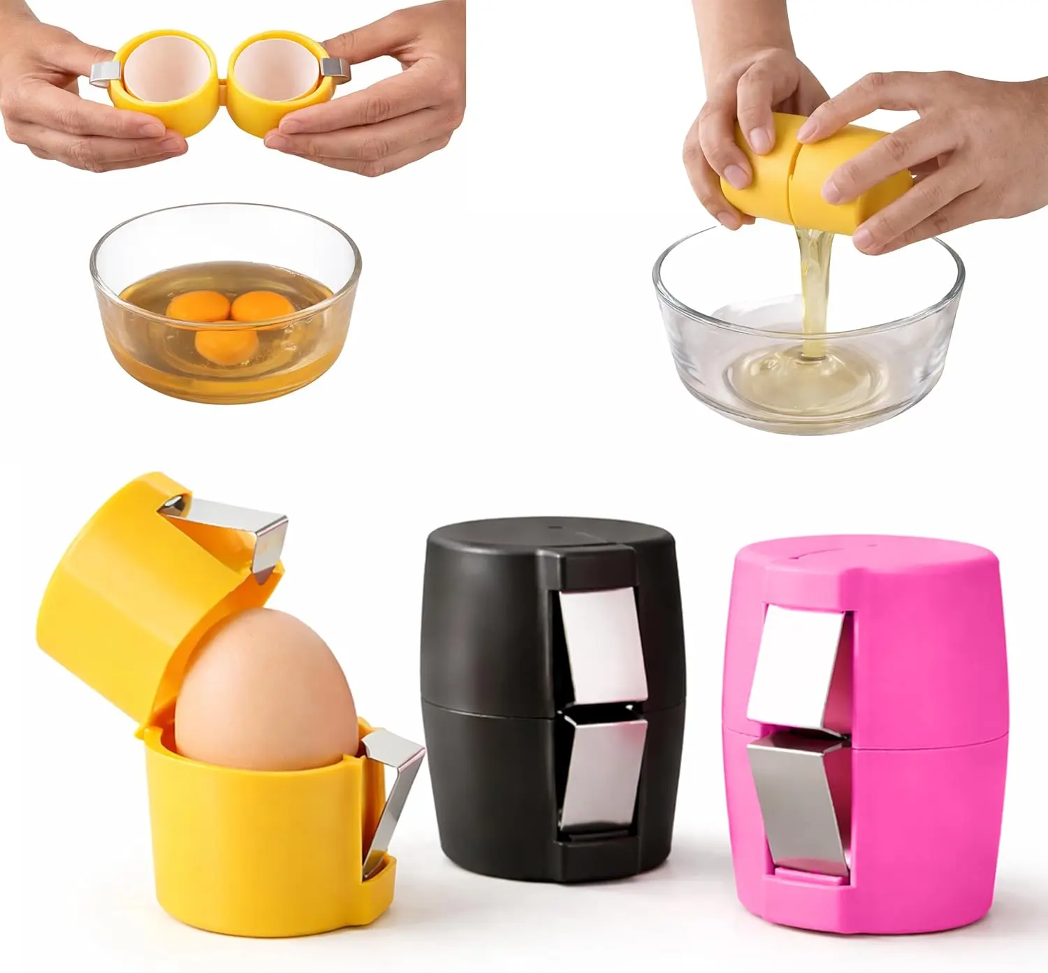·VERSATILE EGG TOOL: Multi-functional kitchen gadget designed to crack raw eggs cleanly, peel hard boiled eggs effortlessly, and separate yolks from whites with precision