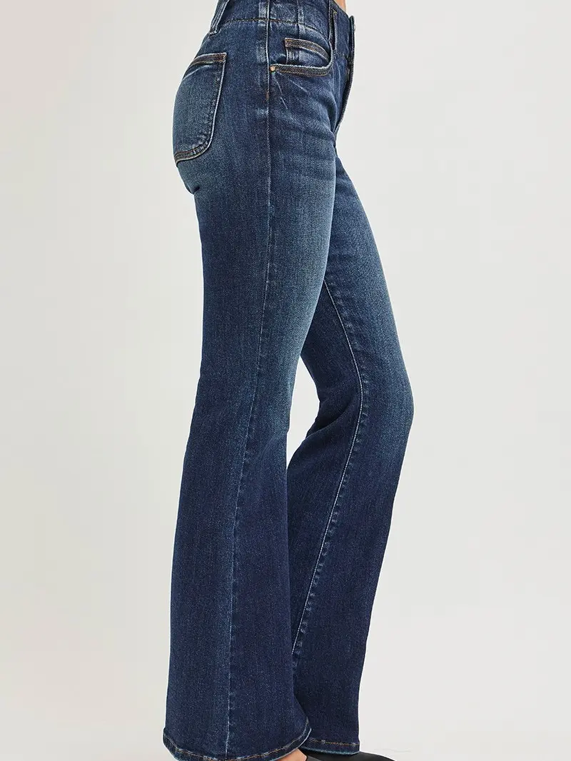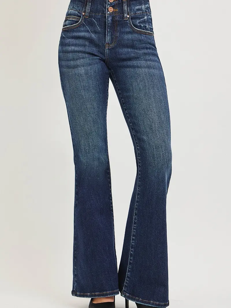 These high rise flare jeans feature a unique seam detail waistband that enhances the flattering high-waisted fit, with a timeless flare leg design that elongates the silhouette and adds a stylish retro touch, combining comfort and fashion to become a versatile staple for everyday and dressy casual outfits.