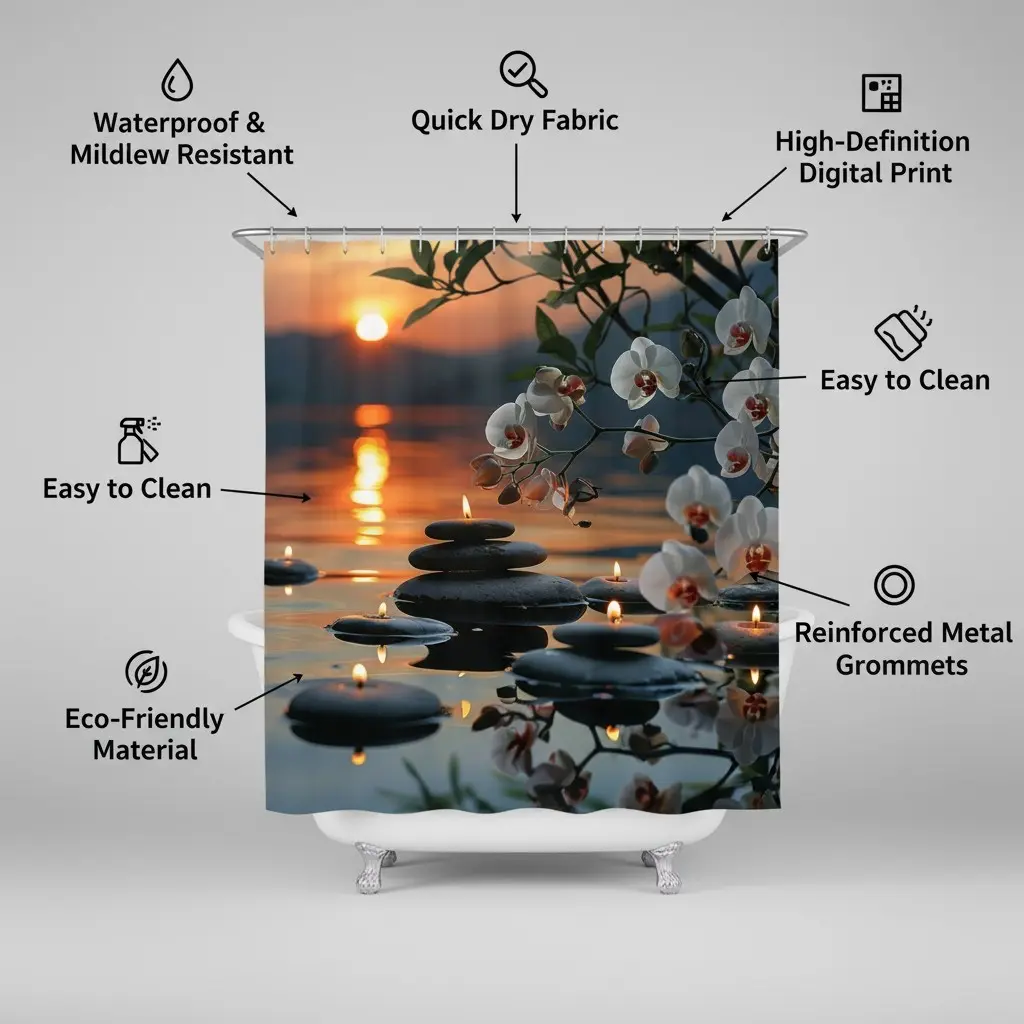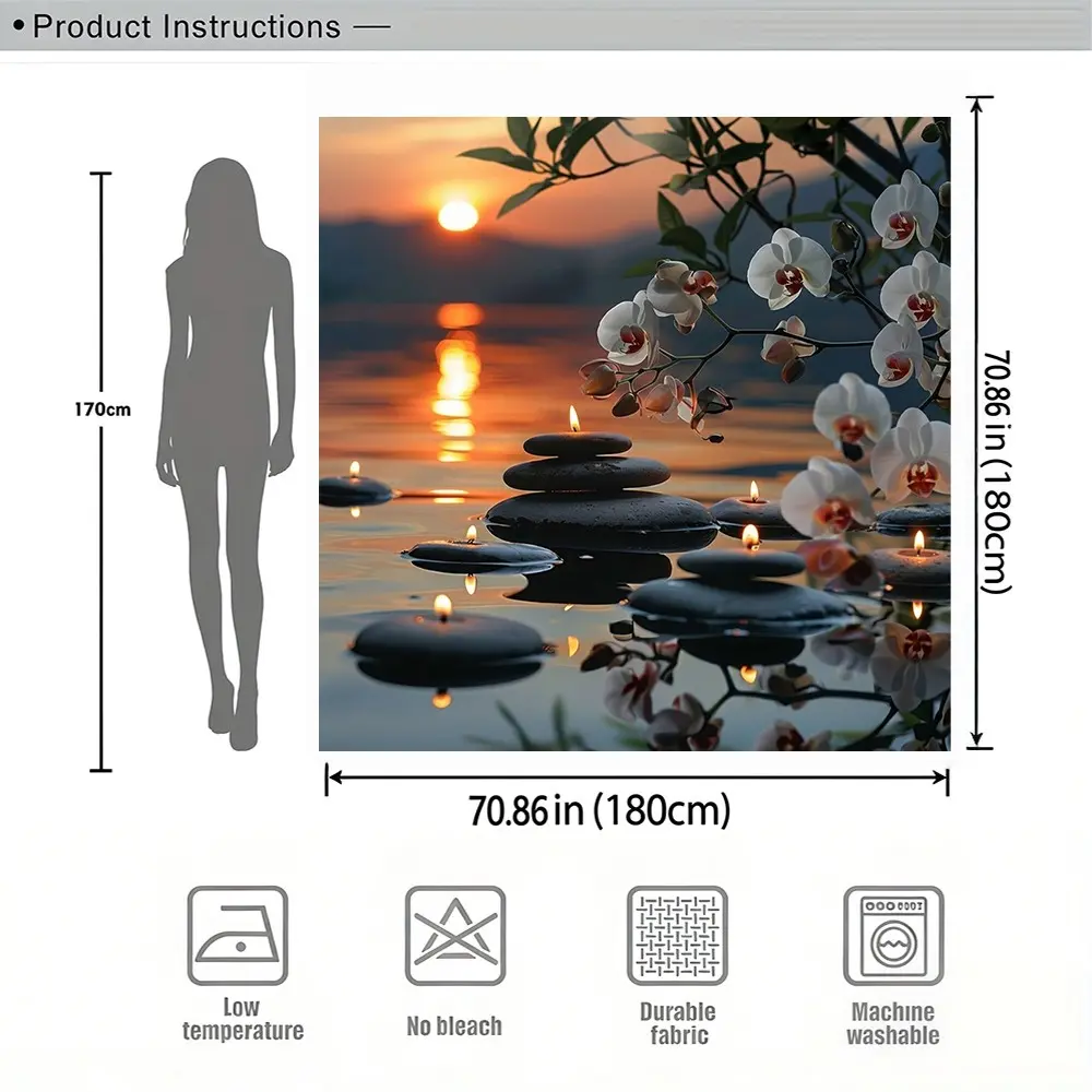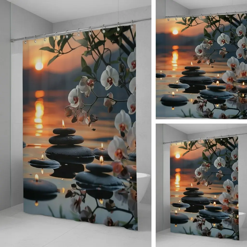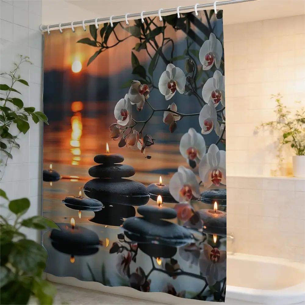 Calm Spa Style Orchid River Stone Bath Curtain, Healing Water Scene Candle Fabric Bathroom Curtain, Soft Polyester Shower Divider