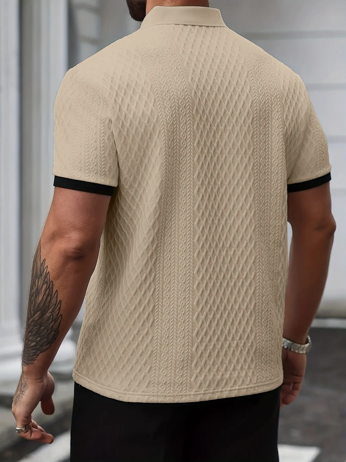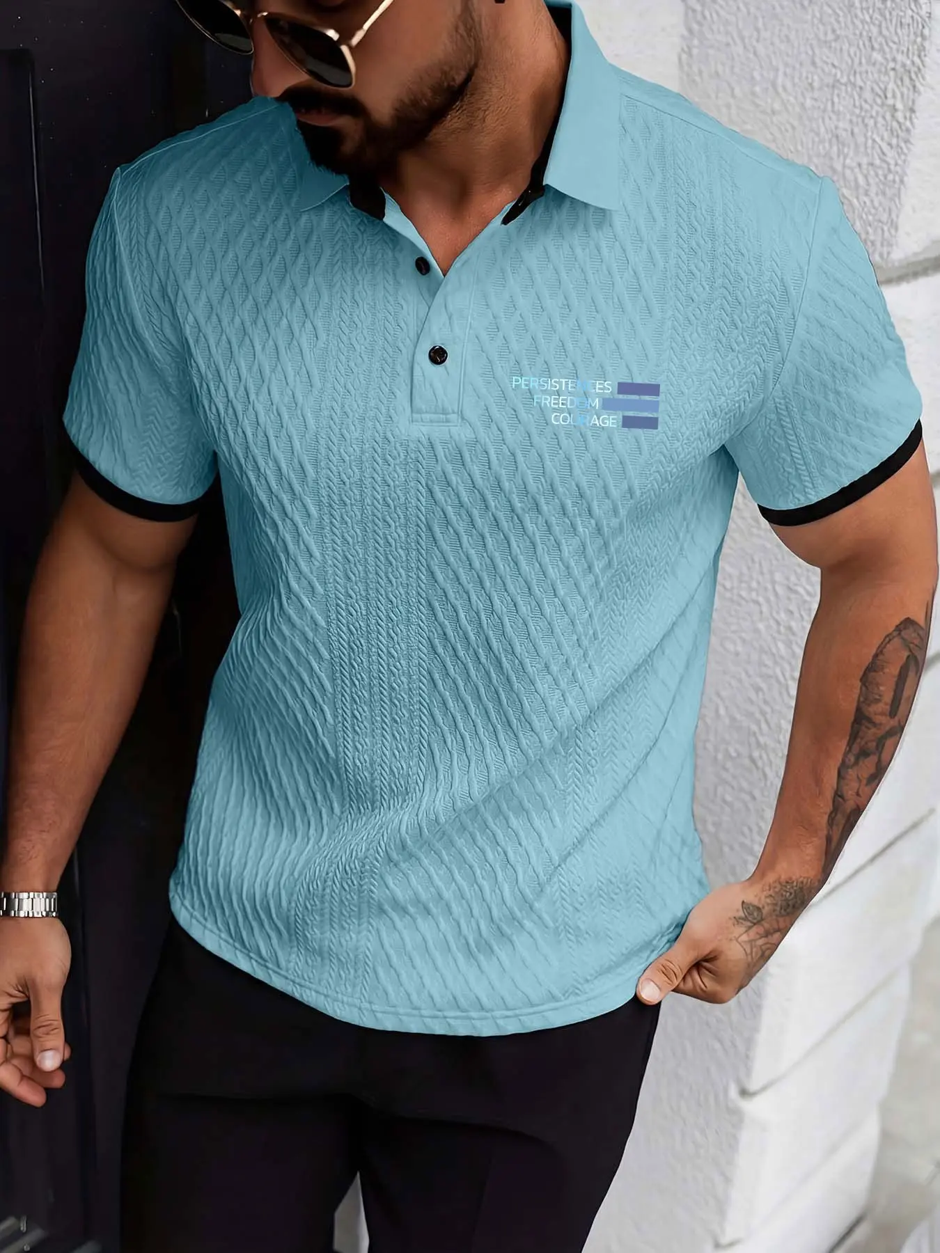 Men's Colorblock Polo Shirt with Textured Pattern, Button Short Sleeve, Geometric and Letter Print, Casual Daily Wear