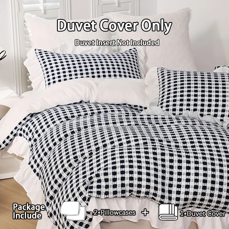 3Pcs Black White Gingham Duvet Cover Set, French Ruffle Vintage Design, Soft Skin-friendly Breathable Cozy, Ideal for Bedroom Dorm Home Decor Daily Use (No Filling, No Pillow Inserts)