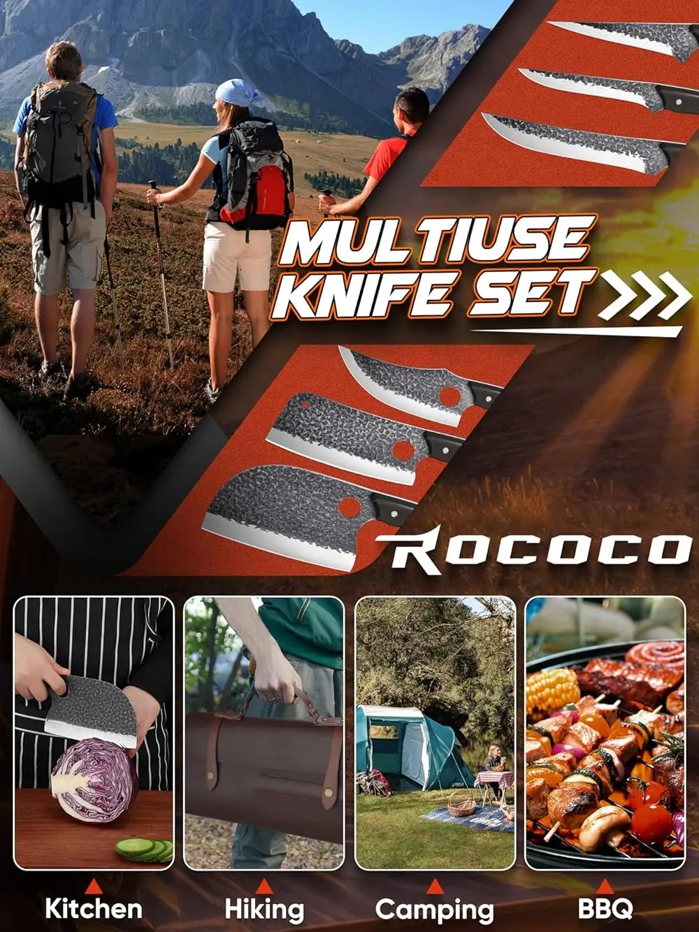 ·13 IN 1 BUTCHER KNIFE SET - The ROCOCO butcher cleaver Set contains 7 knives, 5 accessories and a rolled leather bag. Knives are a Serbian Chef Knife, a Chinese Cleaver knife, a viking knife, 3 boning knives and a peeling knife. Knife accessories include a Sharpening Rod, a Whetstone, a Finger Guard, a pair of woolen gloves, and even a bottle opener. The portable rolled leather bag can store 7 knife and the Sharpening Rod well.