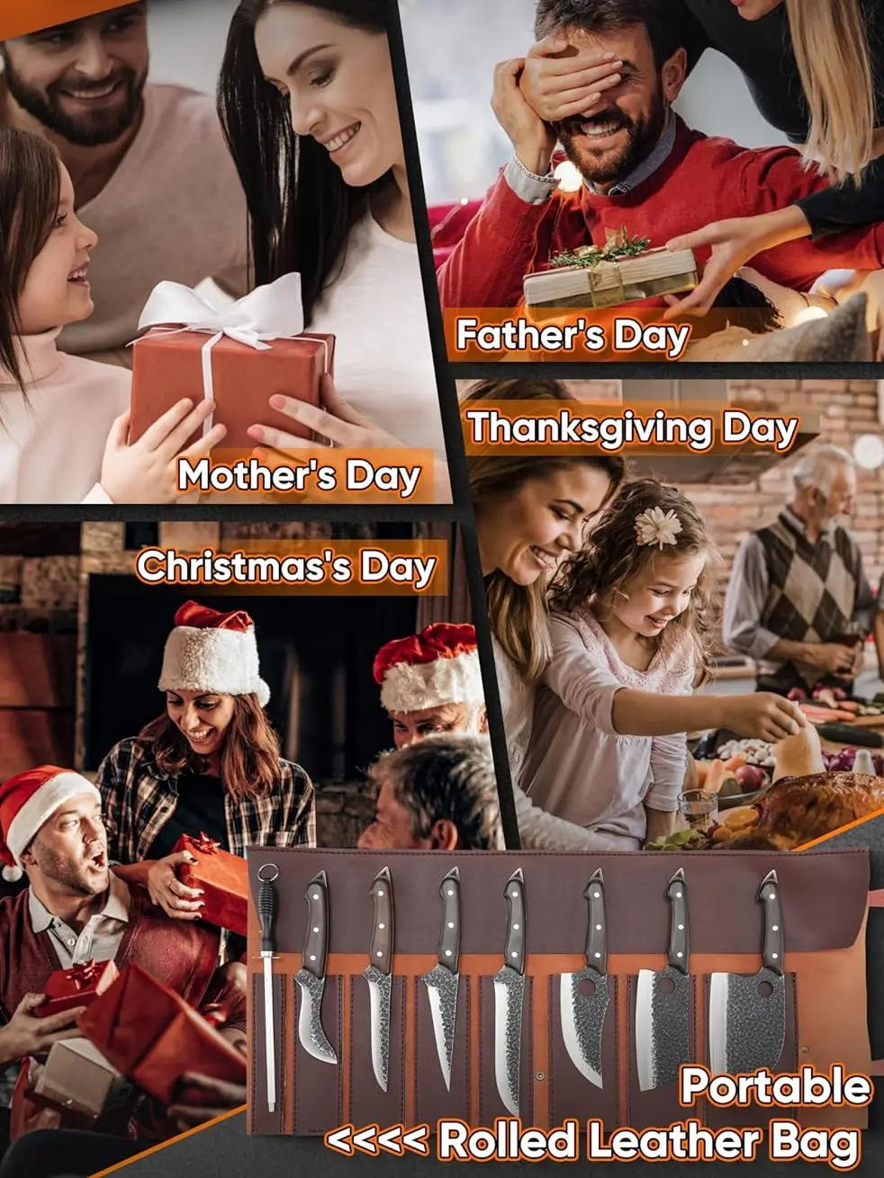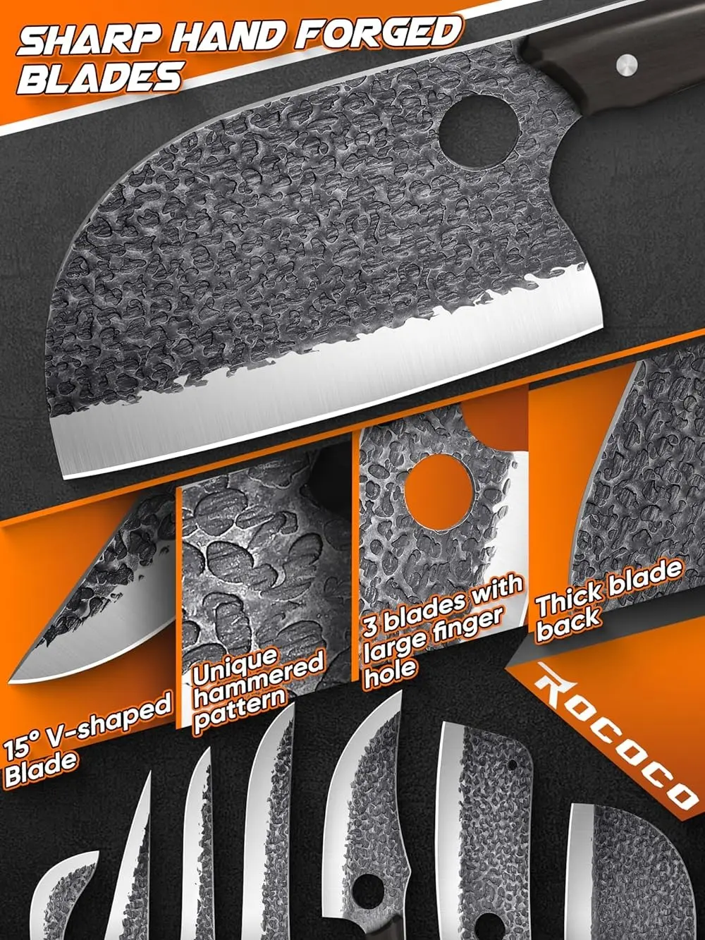 ·MULTIUSE MEAT CLEAVER SET - The multipurpose Serbian chef Viking cleaver set is suitable for cutting vegetables, meat, fruits, filleting fish, deboning meat, chopping soft bones and so on. Equipped with a portable rolled leather sheath, it’s easy to carry around when you are having a BBQ, camping, hiking and doing other outdoor activities. Undoubtedly, it's a fantastic addition to your collection and will be a special gift for your family and friends on Birthday, Thanksgiving Day, Christmas Day and others.