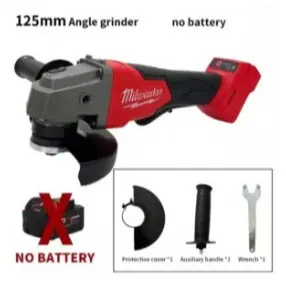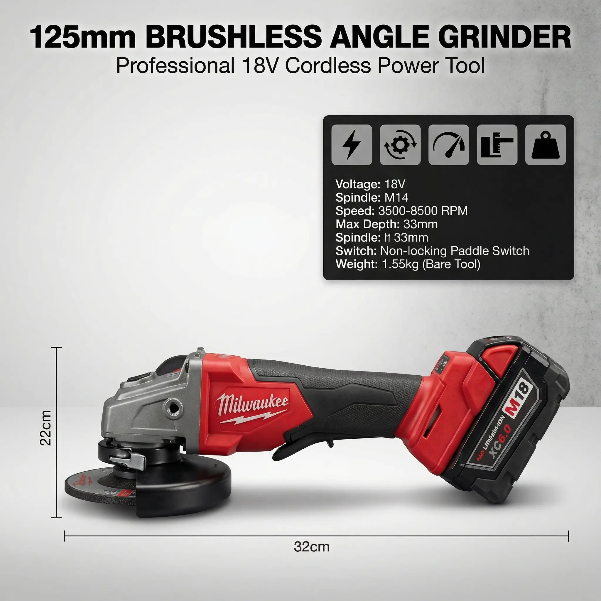 Milwaukee M18 brushless 125mm cordless angle grinder, 1suitable for metalworking and masonry cutting, M14 spindle, 8500RPM variable speed, non-locking paddle switch safety function, maximum cutting depth 33mm, includes battery and charger.