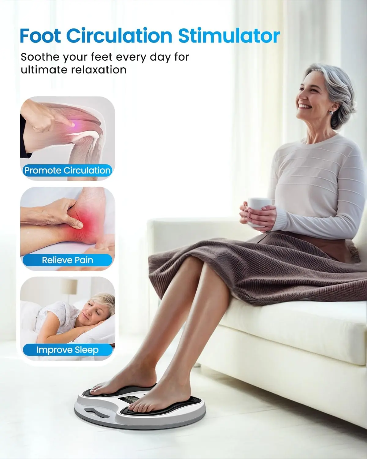·【Clinically Proven Therapies】The foot stimulator for neuropathy uses two clinically proven physical therapies, EMS and TENS (A electrapy neuropathy also known as e-stim). This foot circulation stimulator generate mild electrical currents to deeply stimulate muscles, improve blood circulation and providing relief from muscle pain, neuropathy pain, swollen feet, stiffness, cramps, and numbness. They also help reduce fatigue, improve sleep quality