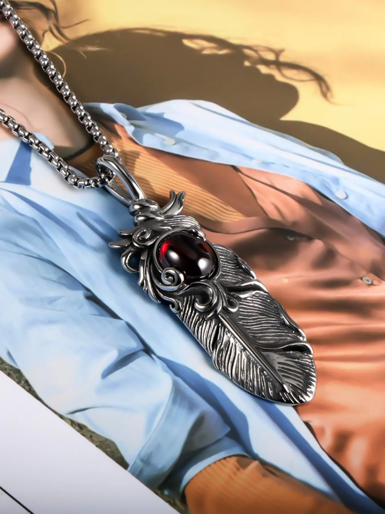 Non-Fading Stainless Steel Necklace, Ruby Feather Pendant, Trendy Men's Fashion Sweater Chain, Creative European Style Jewelry