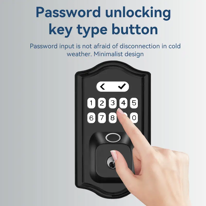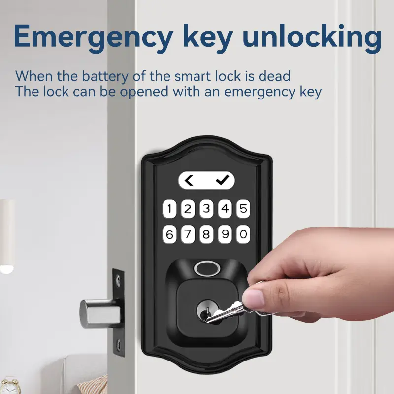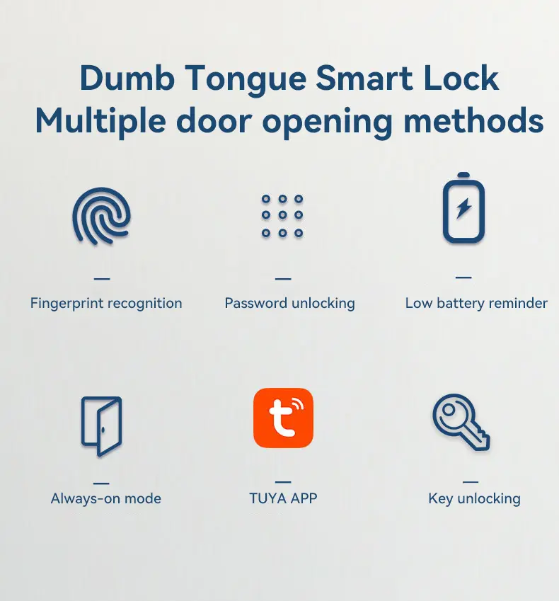 ·6 Ways to Enter, 100% Convenience: Unlock with 1. AI Fingerprint, 2. Custom PIN Code, 3. Physical Key, 4. Tuya Smartphone App, 5. One-Touch Always-Open Mode, and get 6. Low Battery Alerts. Perfect for you, your family, and guests.