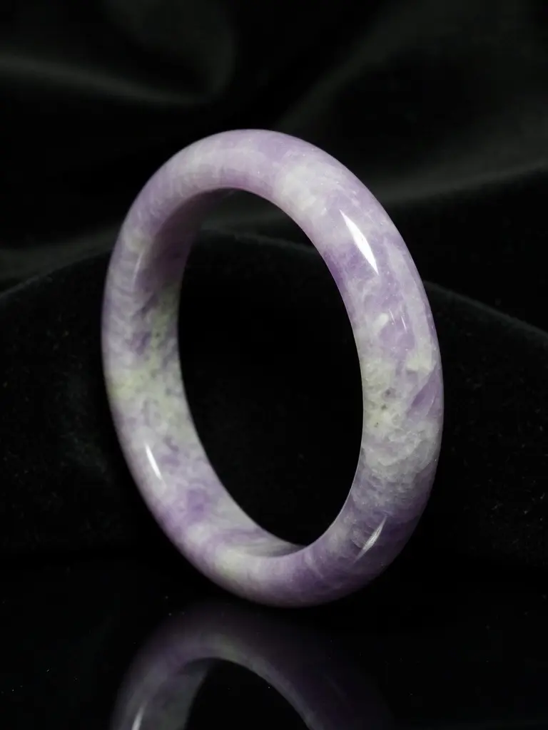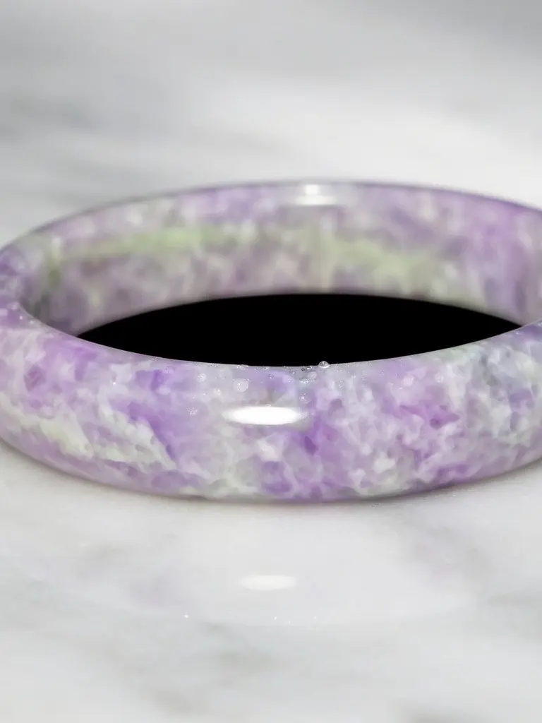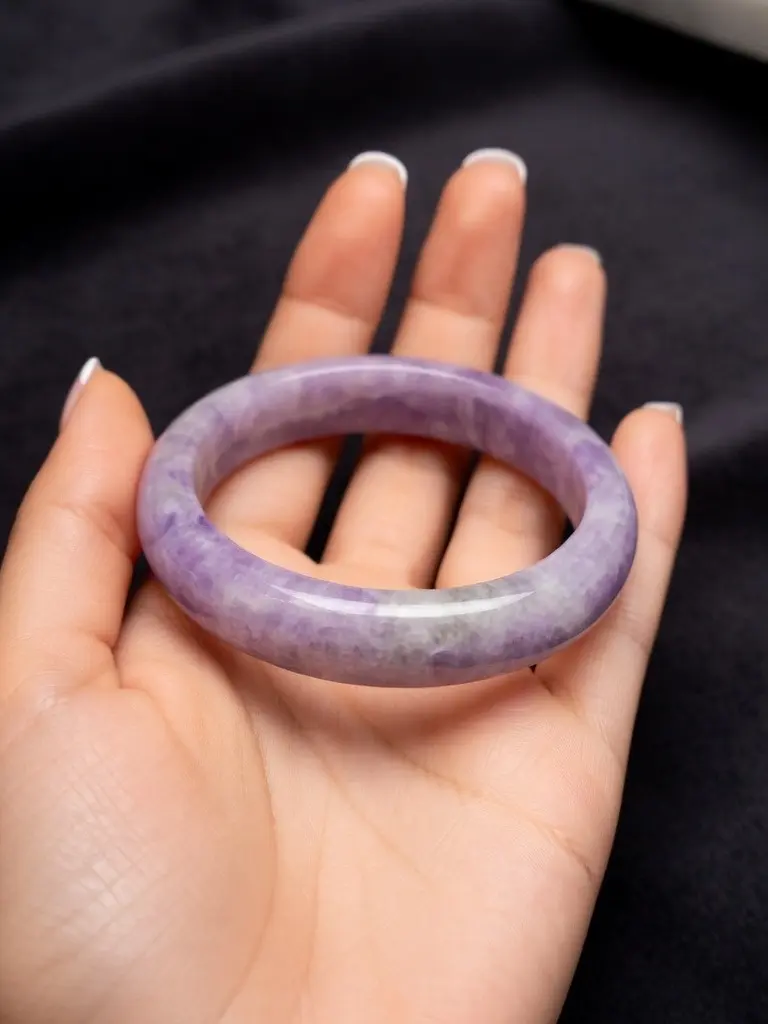 This natural lavender jadeite bangle carries a soft, cloud-like purple tone with subtle white variation throughout the stone. The color reads gentle and elevated — never neon, never dyed — just that classic, misty lavender collectors love.