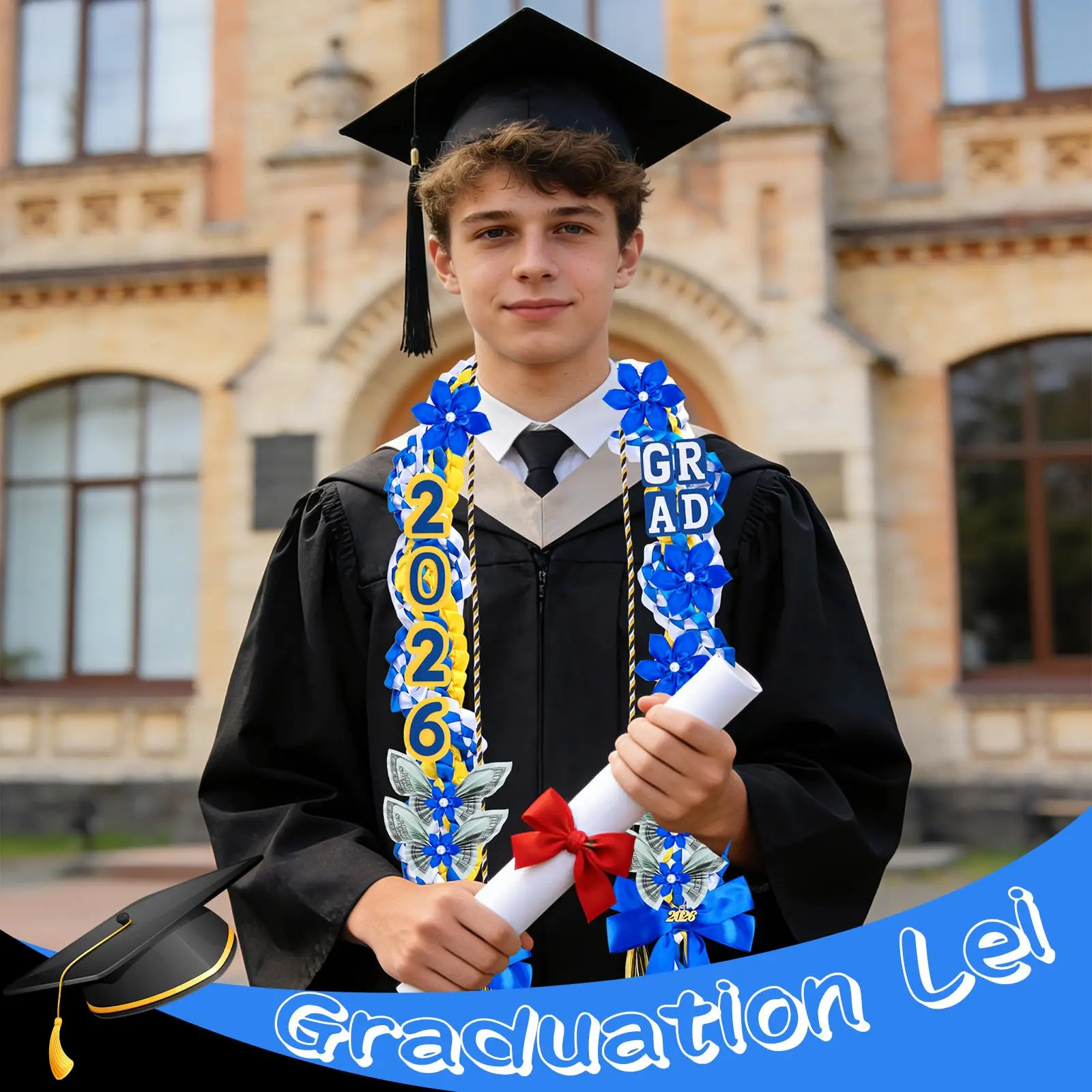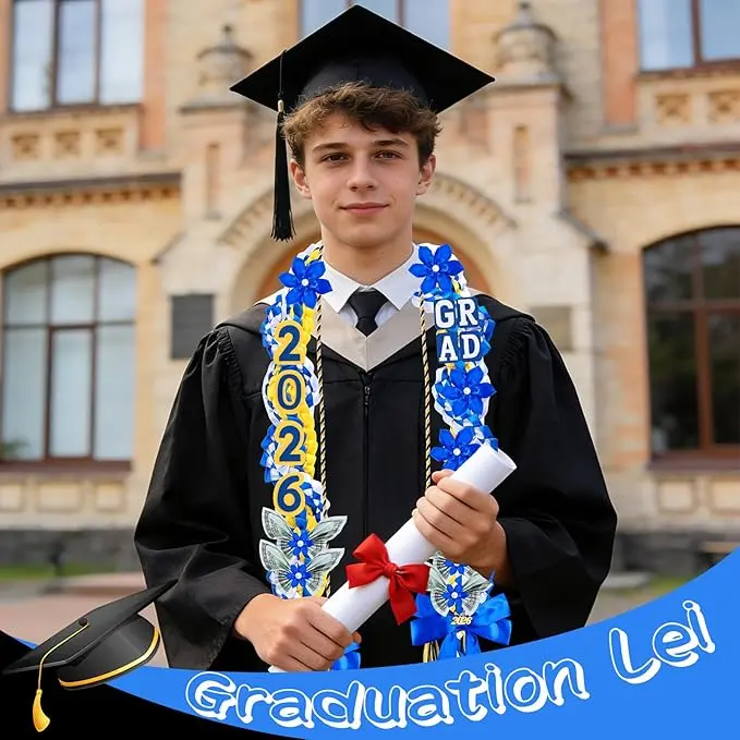 This 21-pack graduation lei set is specially designed for the Class of 2026 graduates. Each lei measures 50 inches, adopting double braided craft with classic blue, yellow and white color matching, full of graduation ceremony sense.