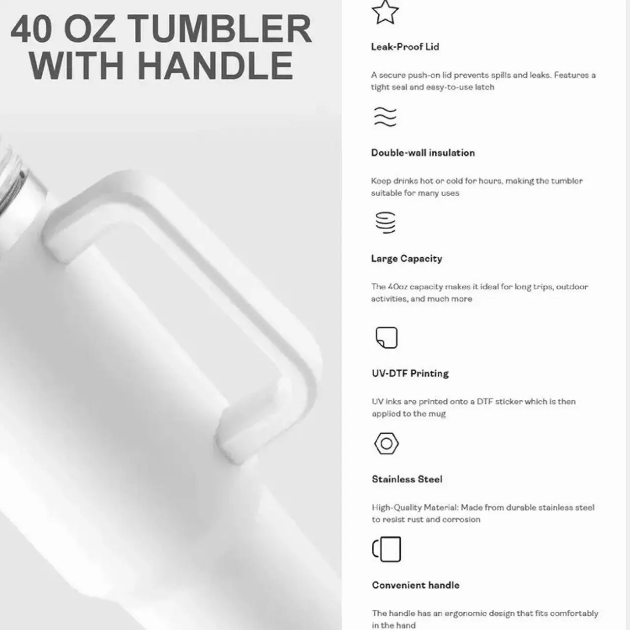 Ergonomic Handle (40oz): Designed for easy carrying all day long.
