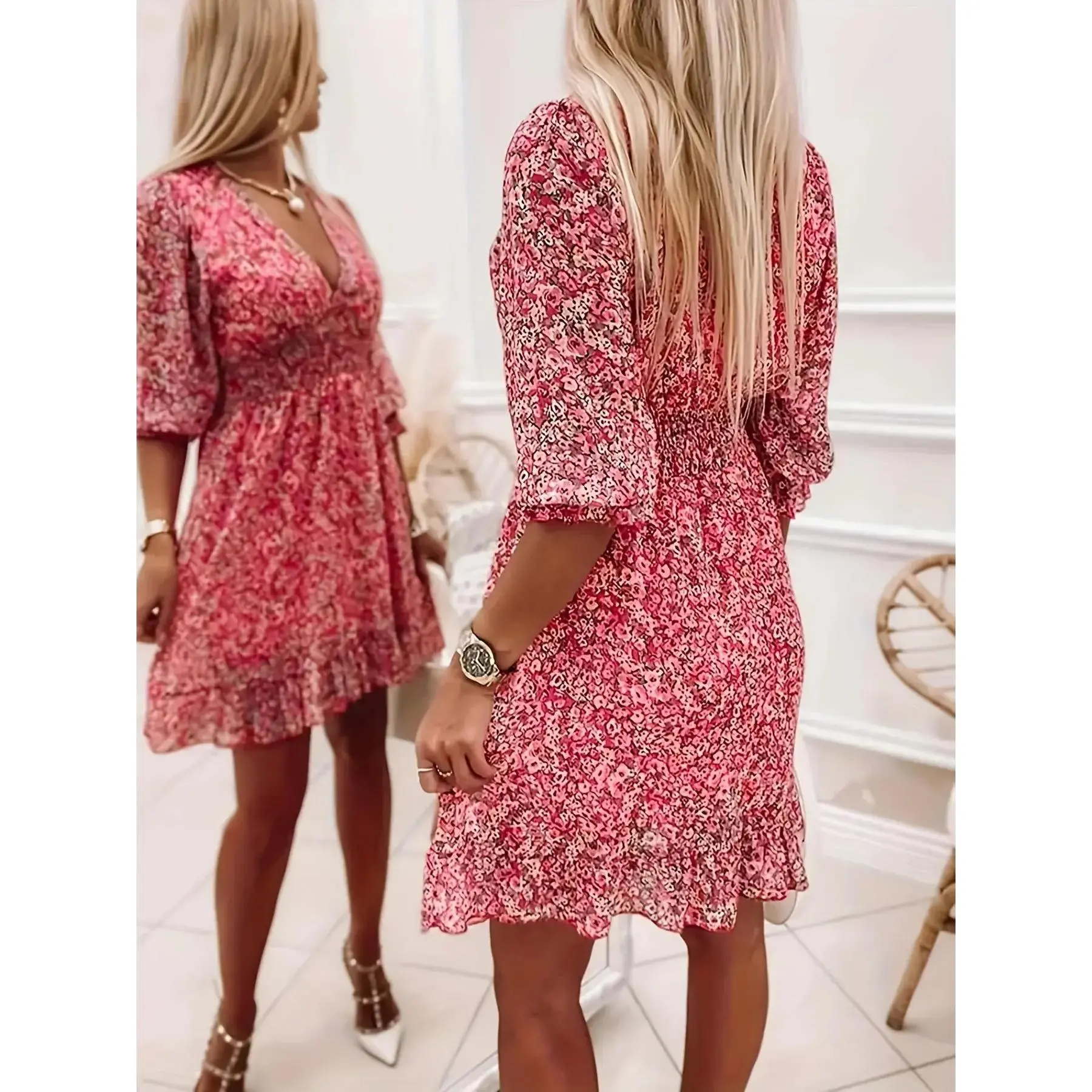 Women's Frenchy Casual Style Ditsy Floral Print Shirred Ruffle Hem Flounce Sleeve Dress, Boho V Neck A-Line Short Dress For Summer Party Holiday, Summer Outfits 2024, Women's Clothes
