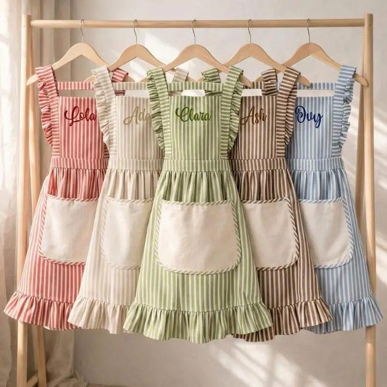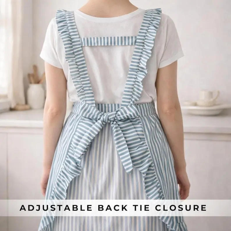 5. Personalized Striped Linen Apron, Embroidered Custom Name Apron, Kitchen Cooking Ruffle Vintage Chef Apron with Pockets, Gift for Mom